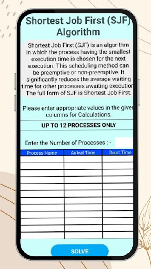 2. Shortest Job First (SJF): Analyse the SJF algorithm by inputting the burst time for each process. The app will determine the shortest job and calculate the waiting time, turnaround time, and Gantt chart, allowing you to optimise your scheduling decisions.
