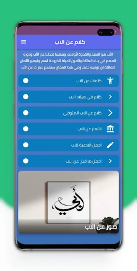 The Talk about the Father application provides quotes about the father on your mobile phone or tablet with ease through one program that contains several sections. The Talk about the Father application is also distinguished by being free and is also available on the store for Android phones. You can download the application of words about missing the father with ease so that you can get many phrases wherever you want and in high quality without the Internet.