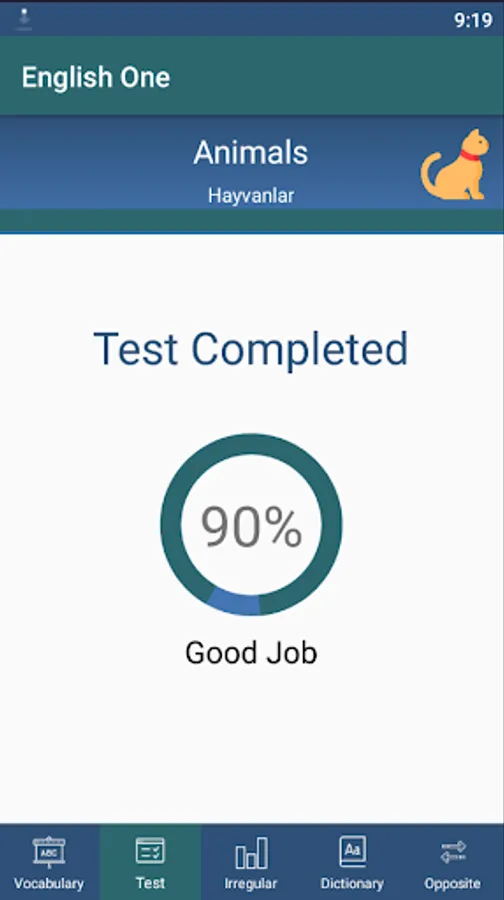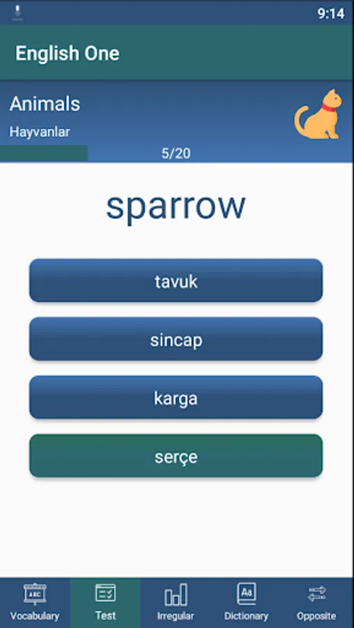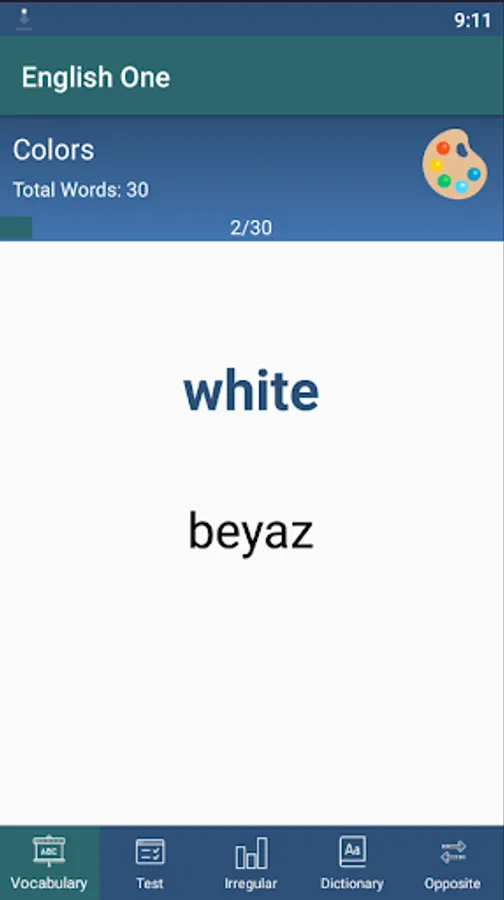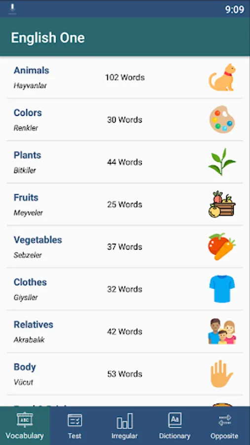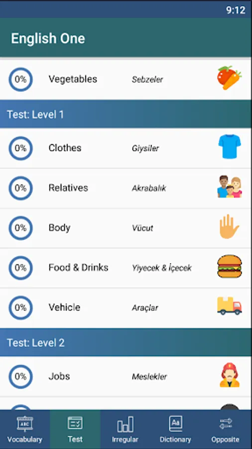 - Test: Thousands of words from 40 different categories and hundreds of tests and results evaluation system, each consisting of 20 questions