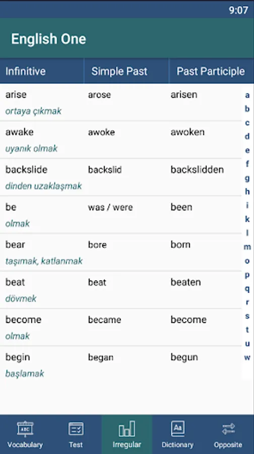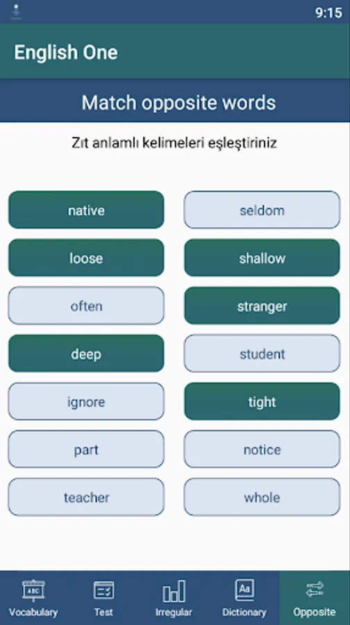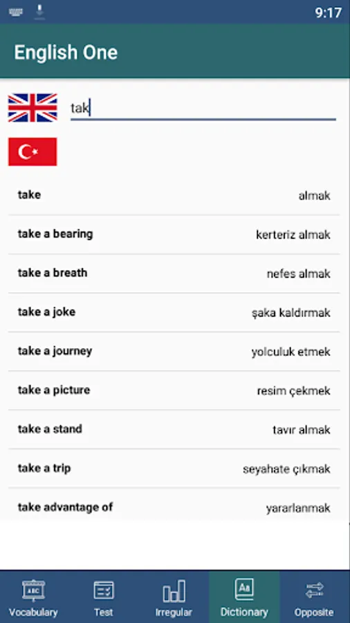 You will learn English in a very pleasant and effective way with English Turkish language education application. In the application you will find everything you need with different categories words tests phrasal verb opposite word phrases adjectives verbs and dictionary. Content: