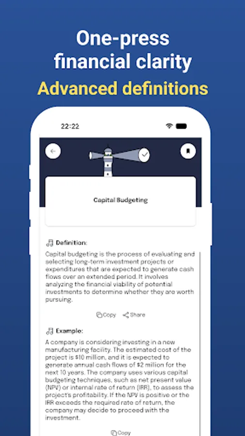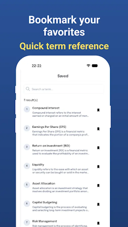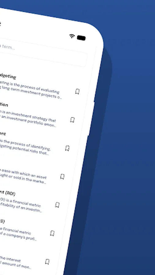 Search and Bookmark: Effortlessly search for specific terms or concepts and bookmark your favorites for future reference. Offline Access: No internet connection? No problem! Download the entire dictionary for offline access, ensuring you have valuable financial information even when you're on the go.
