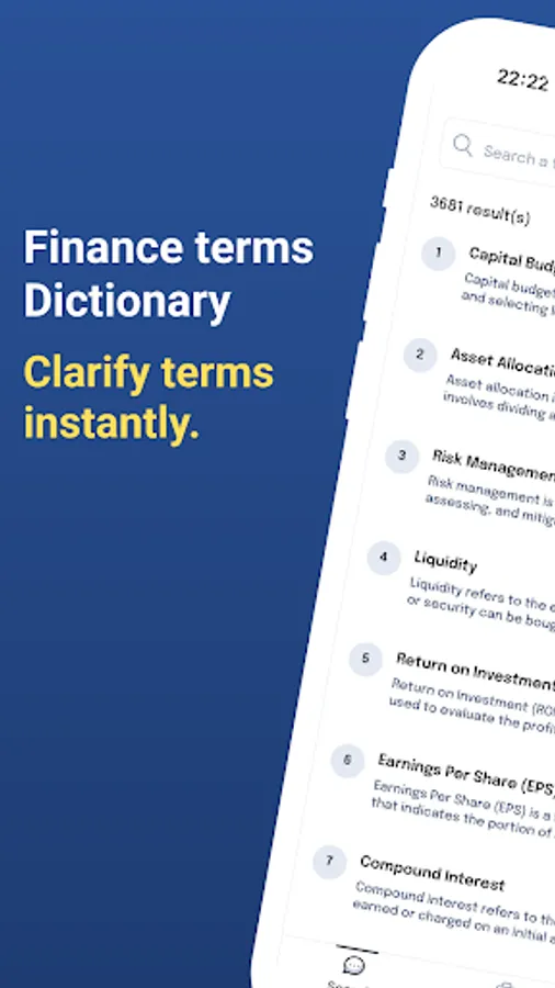 Unlock the world of finance with the Finance Terms Dictionary app, your go-to resource for understanding complex financial concepts. Whether you're a seasoned investor, a finance student, or simply interested in expanding your financial knowledge, this app is a must-have in your digital toolbox. Discover a comprehensive collection of finance terms, acronyms, and definitions at your fingertips. From the basics of personal finance to intricate corporate jargon, this app offers clear and concise explanations, making complex financial concepts easily accessible to all.