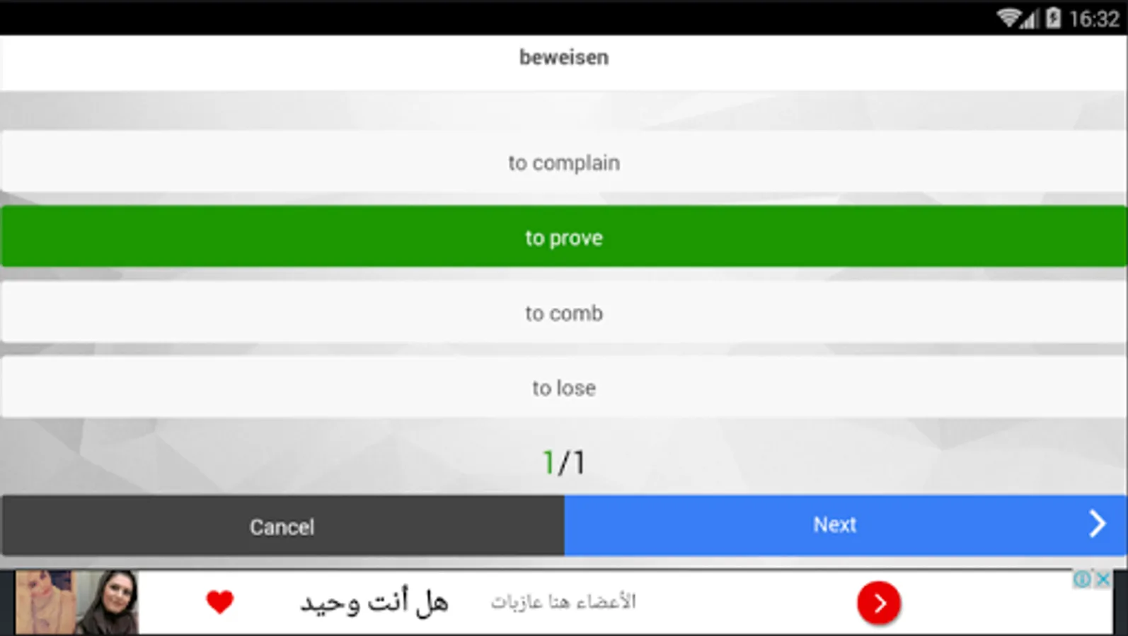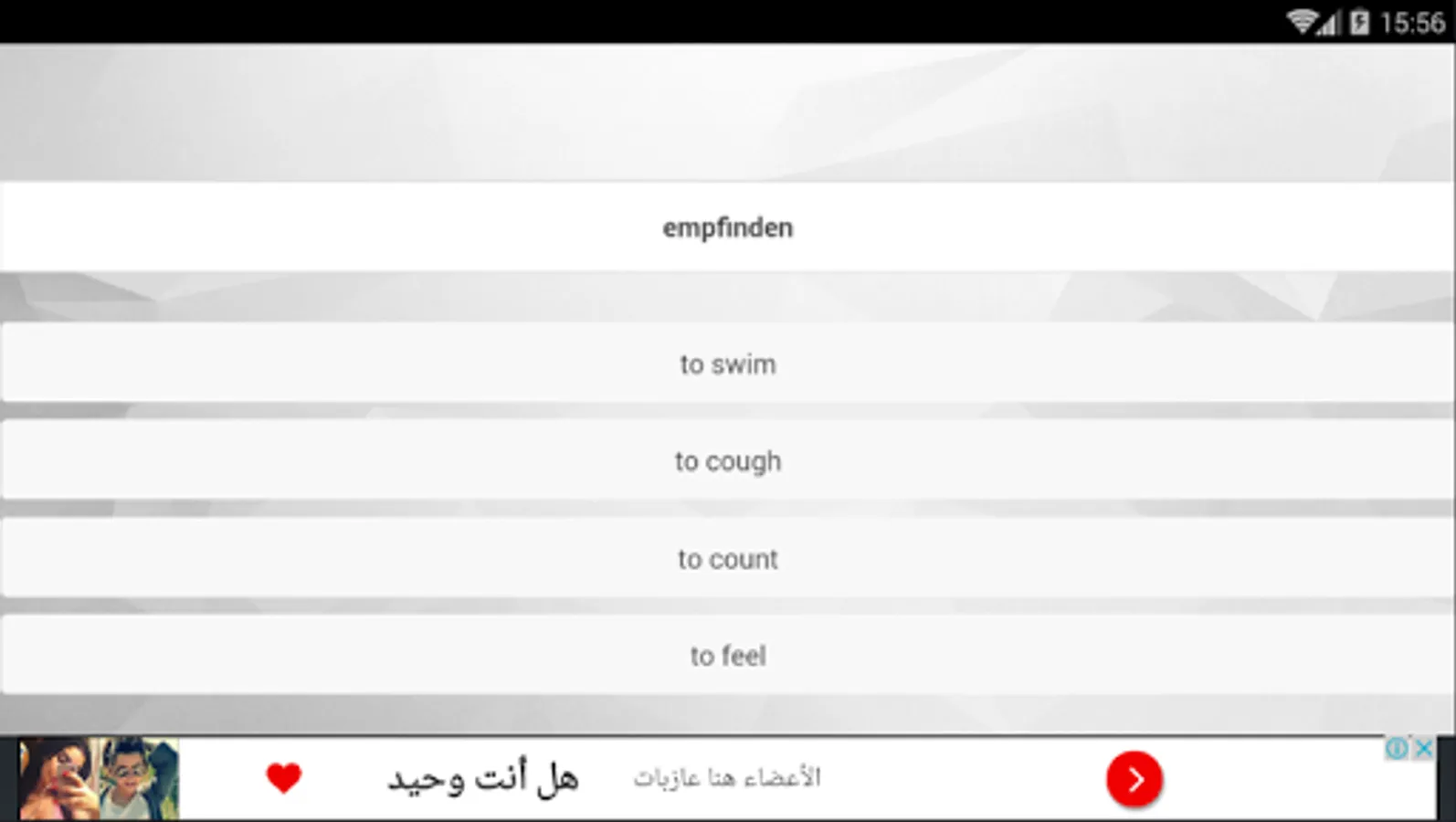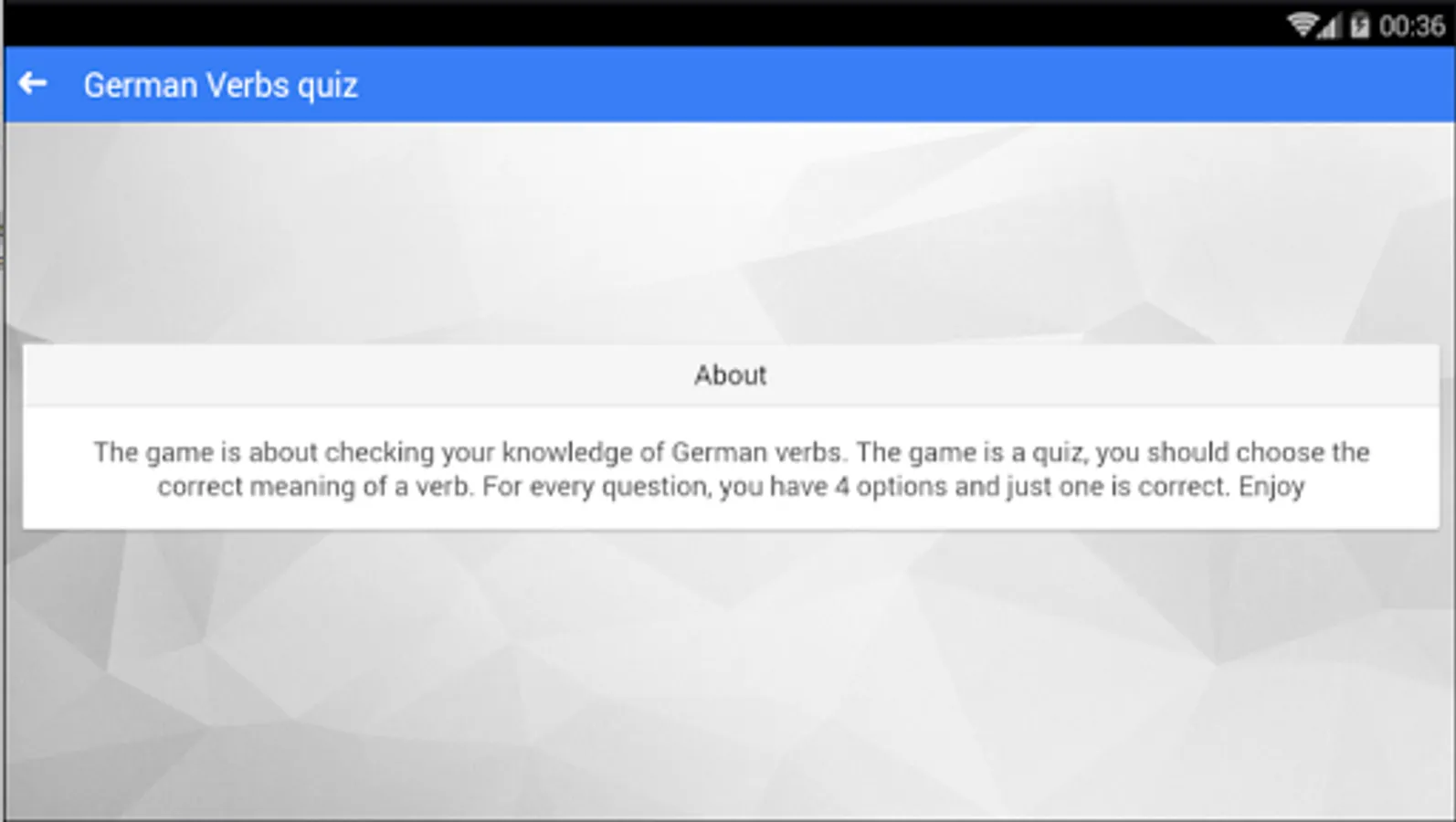 The German Verbs game is about checking your knowledge of German verbs. The game is a quiz, you should choose the correct meaning of a verb. For every question, you have 4 options and just one is correct. learn german online is a waay to make a quieck progress in german learning