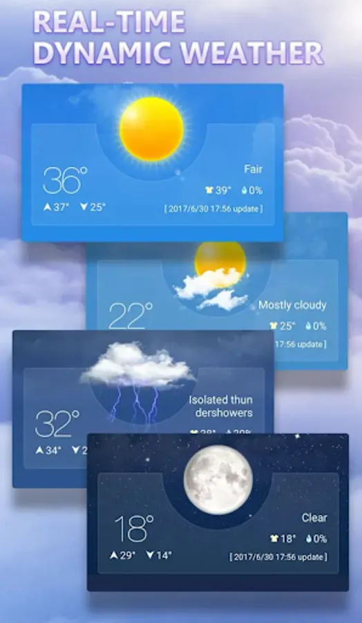Various weather widgets with current temperature, real-time weather, weather forecast, city, clock & calender of current location.