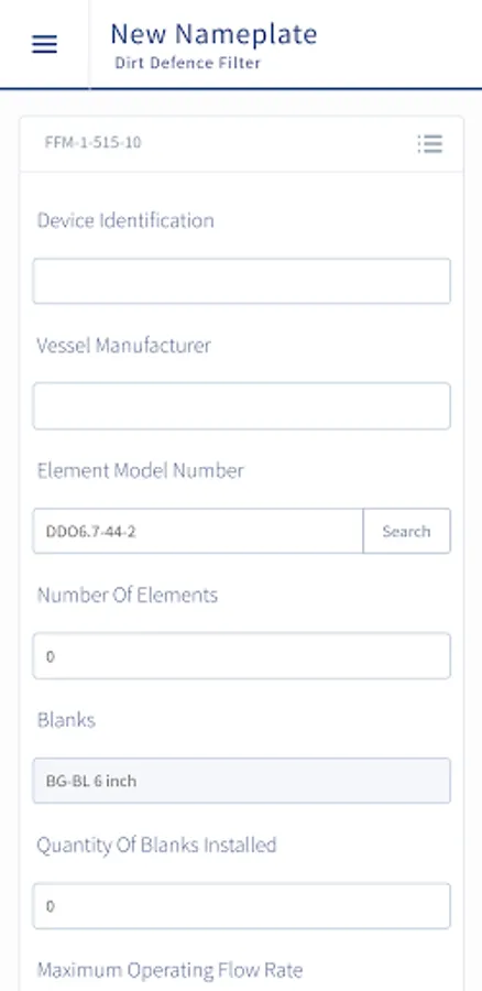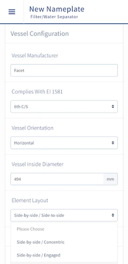 The app offers the possibility to generate similarity data sheets for filter/water separators according to specification EI 1582. All orders and drafts are stored and can be called up for further use.
