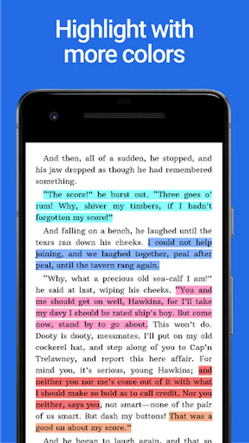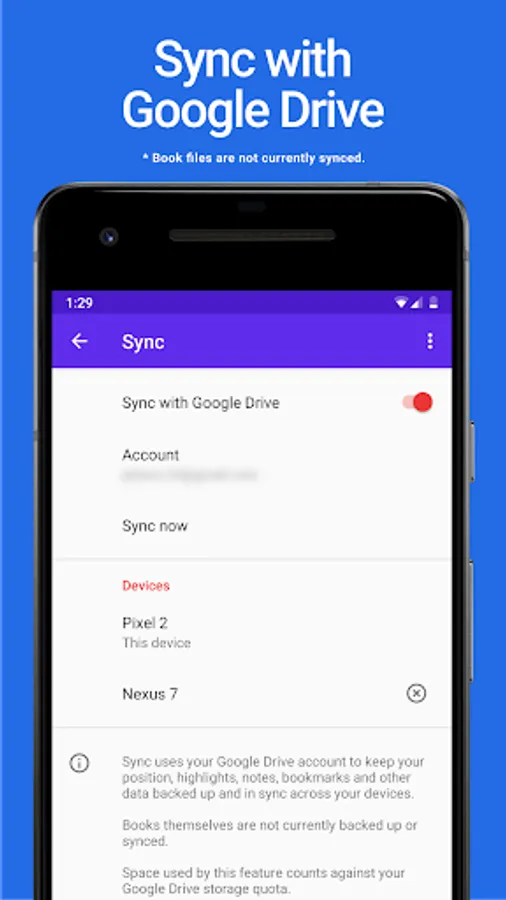 • Sync: Keep your data backed up and in sync across your devices using your Google Drive account. (Books themselves are not currently backed up or synced.)
