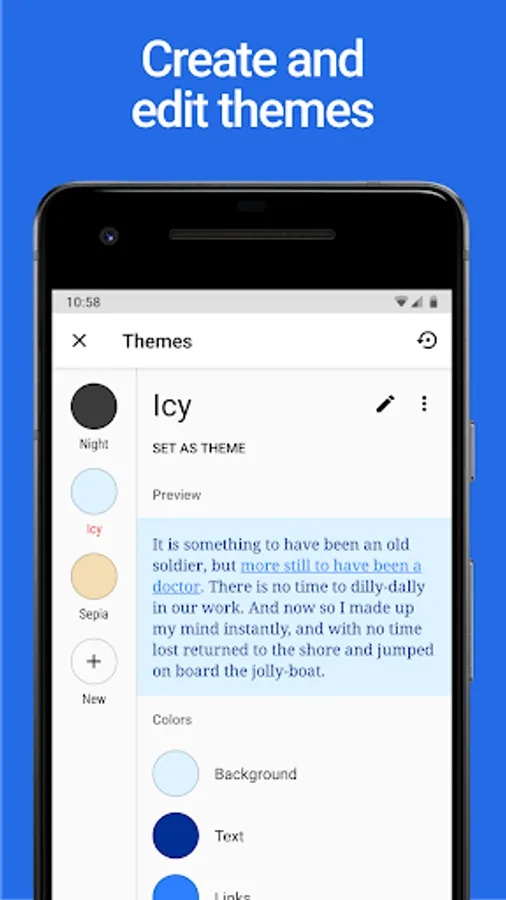 • Custom themes: Customize your page background color, text color and link colors. Create, delete and edit themes. You can access the custom themes feature by tapping the three-dots under Theme in display settings after upgrading.