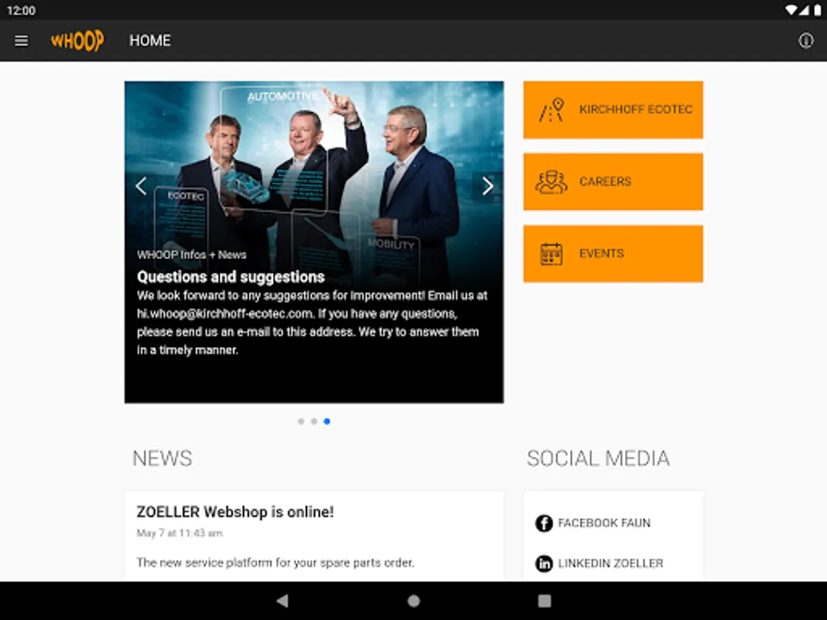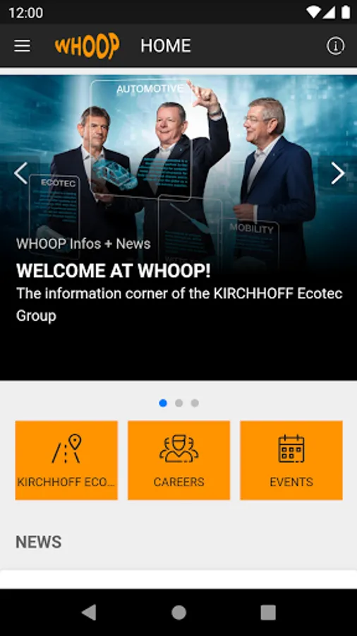 In our app, customers, partners, employees and interested users will find general information and news about the companies of the KIRCHHOFF Ecotec family, as well as job vacancies and an event calendar. Keep up to date with the latest news about the KIRCHHOFF Ecotec family and what keeps us moving.