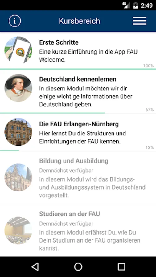 In this app you will learn in different learning modules everything about studying in Germany and at the University of Erlangen-Nuremberg. In our interest test you can find out which program is right for you and our numerous test tasks will show you if you are fit for studying. With our videos and testimonials from students and graduates you get a first-hand impression of the study at FAU.