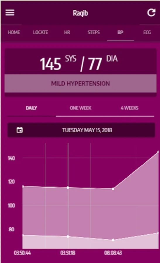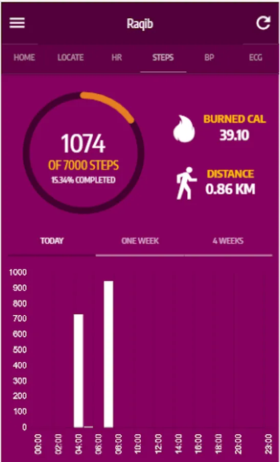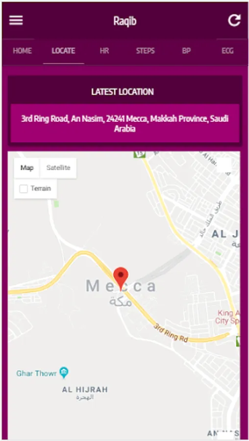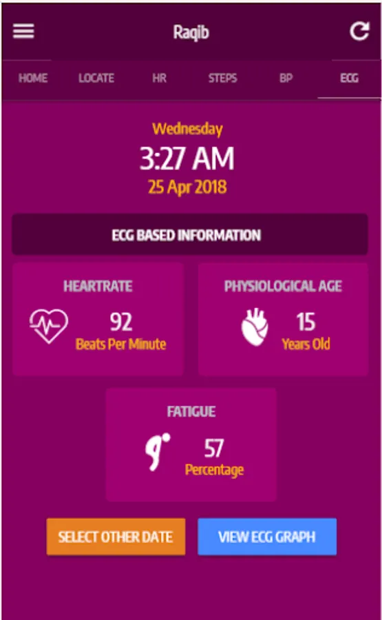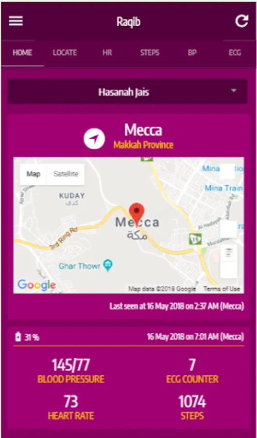 The Raqib mobile application shows all the relevant information of the wearer such as the location, pulse rate, steps, blood pressure, ECG, fall detection, alerts and others. The vital parameters are monitored and displayed on the app depends on the type of watch features that the pilgrims wears.