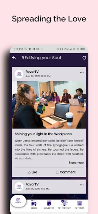 FavorTV is a faith-based mobile app that seeks to showcase different ministers and ministries, stream content from different ministers, create a discussion community, and share relevant content with Christians.