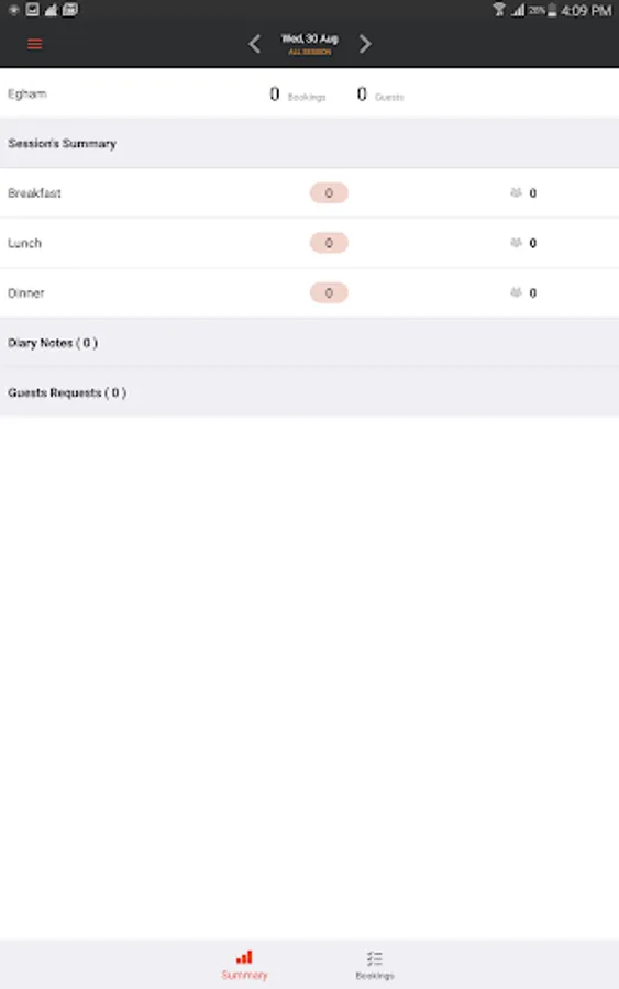 Summary tab gives quick access to your day that includes Guests notes, diary notes and booking summary.