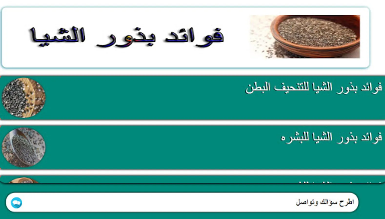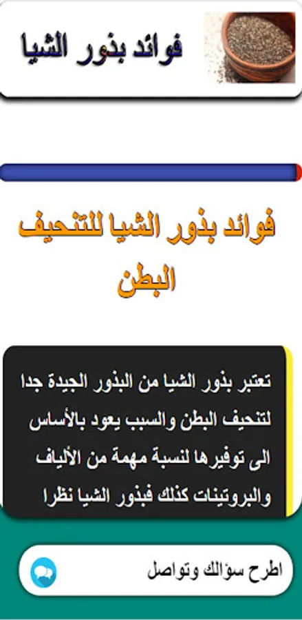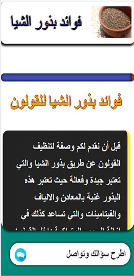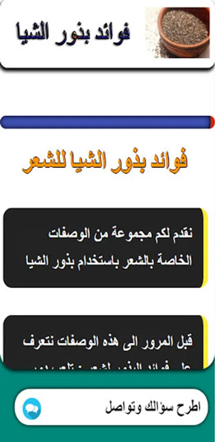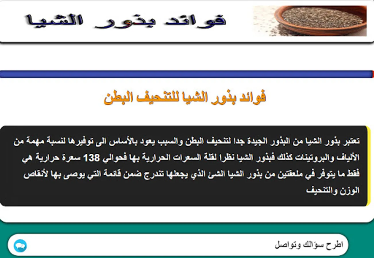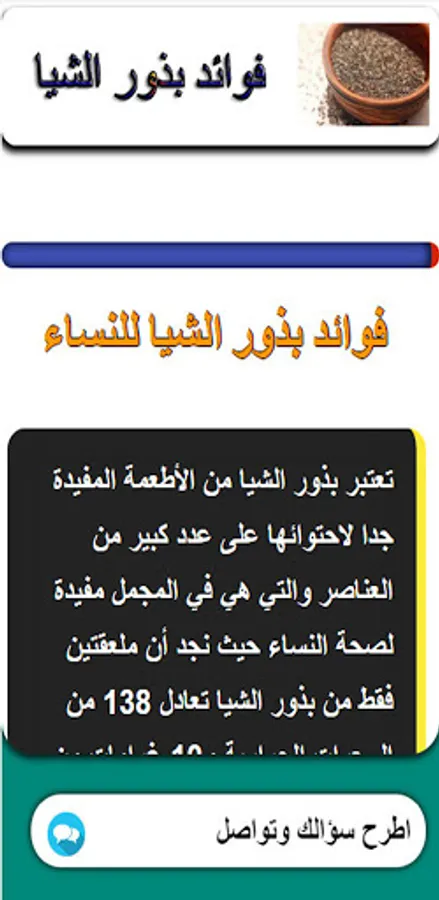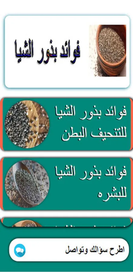 Benefits of chia seeds An application that provides you with important information about chia seeds and benefits through this application that provides the benefits and benefits of chia seeds. We tried to provide a group of sections and also we provided you with a special section for communication via the application to share more information and the application section is as follows: