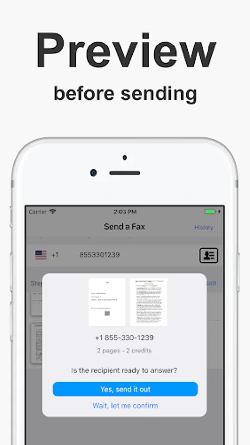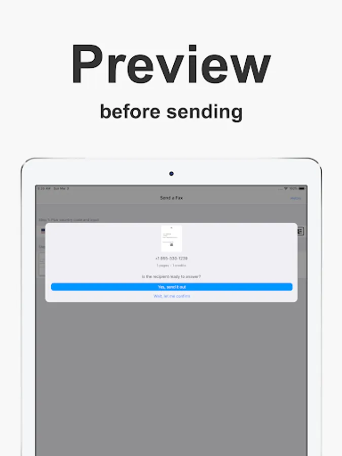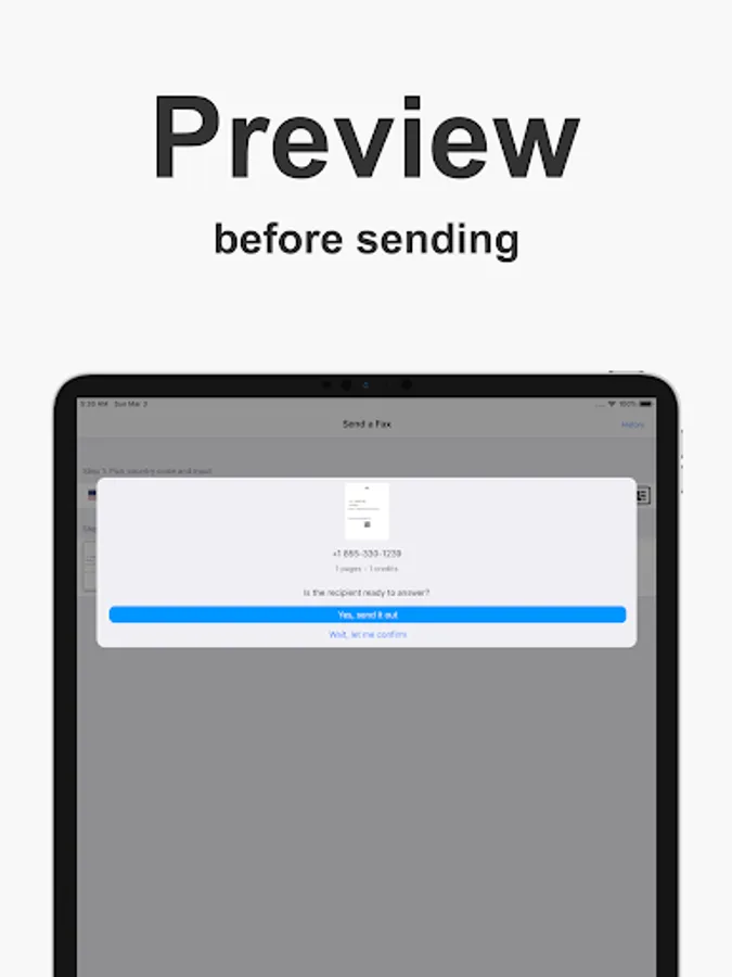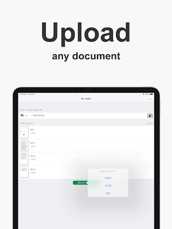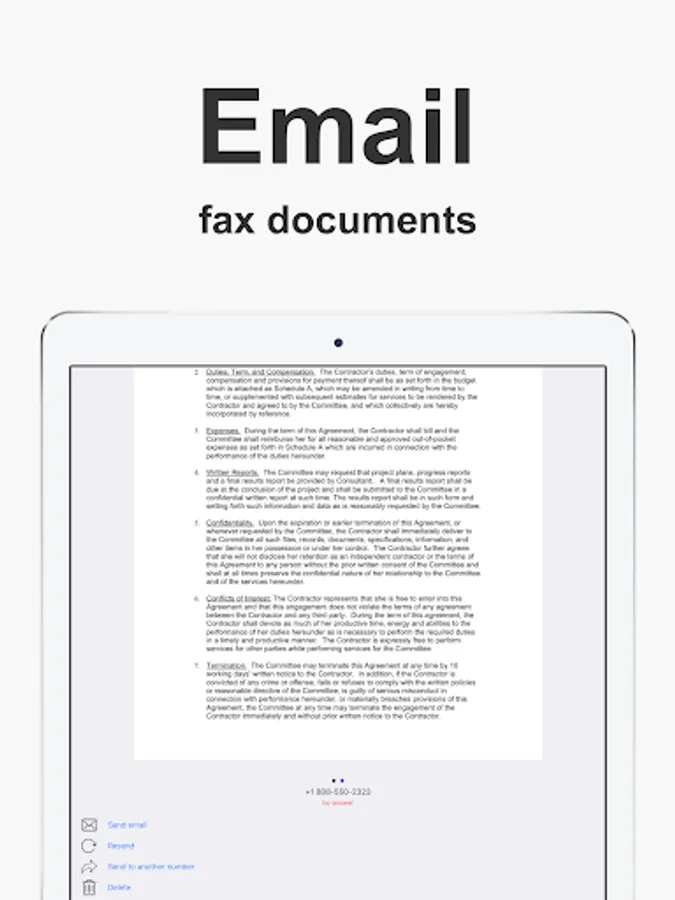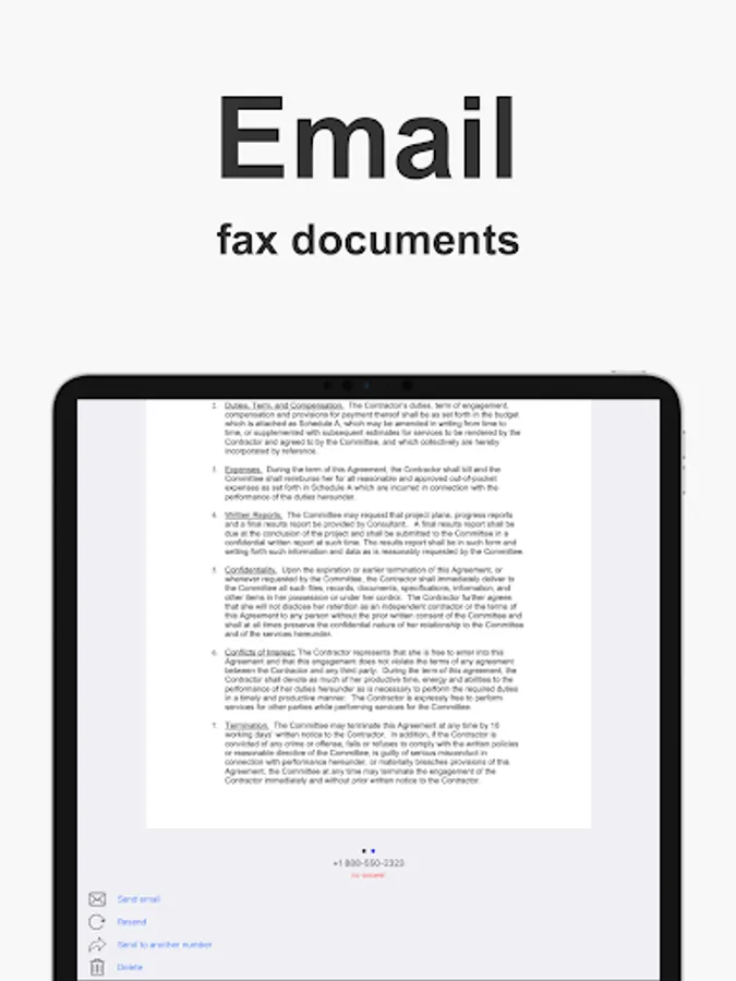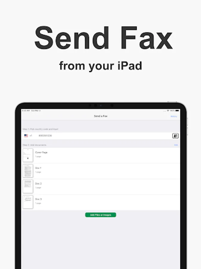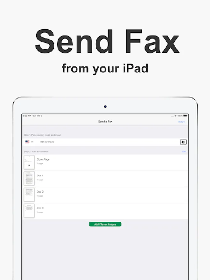 Send fax (three taps): input the recipient's fax number, pick your document and send out!