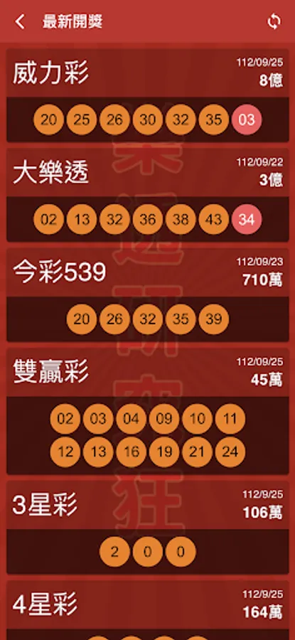 Provide Taiwan Lottery Big Lotto, Power Lottery, Jincai 539, 38 Lottery, 49 Lottery, 39 Lottery, Double Win Lottery, Three Star Lottery, Four Star Lottery and other redemption information.