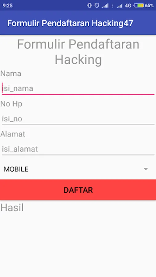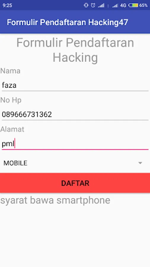 This hacking registration application is made to take part in the semester 6 android studio courses.