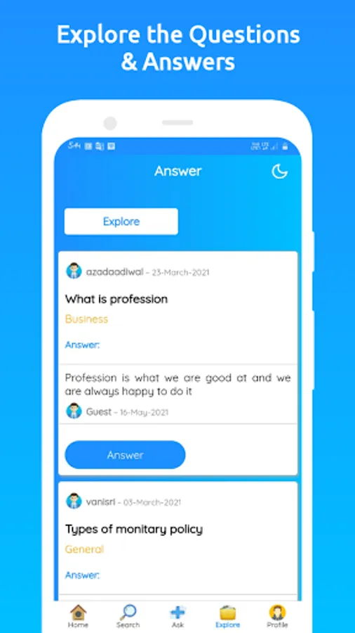 Answer is a simple Q&A Platform. It is a simple and best Questions and Answers app. It was specially designed for learners and students, who can ask their doubts and solve the doubts of others. So, you can help others in their homework. Answer is the best doubt solving and doubt clearing app. It is also called as ask questions, ask answers app. This is the best doubt solving app for students. If you want some help in your homework, then you can ask that question in this app. If someone knows the answer for that question, then they help you by giving his answer. You can also spend some of your time in explore feature, which gives the best questions that has been solved. So, you will learn something new from that. By using answer app, you can spend your time in good and useful way.