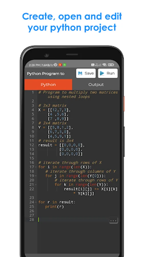Experience the power of coding Python on your mobile device with Python IDE. This high-speed app delivers accurate results with exceptional efficiency. Its sleek and intuitive user interface ensures a seamless coding experience, day or night.