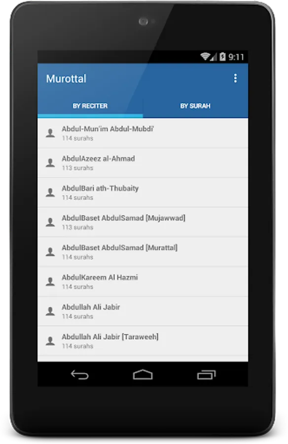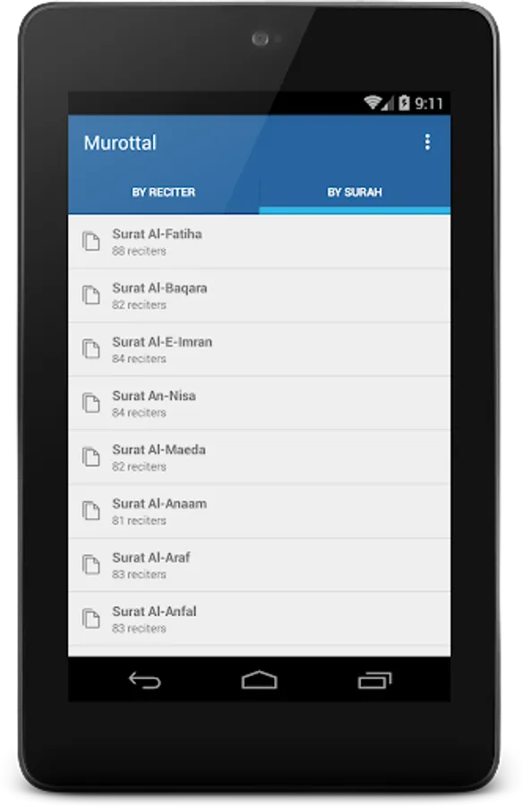 Murrotal - Quran Audio is the most complete and easiest to use quran audio app on the store. Built with friendly user interface, this app can change your way on browsing, downloading and listening the audio of Quran. All mp3 audio listed and downloaded from www.quranicaudio.com. Murottal comes with some of very useful features.