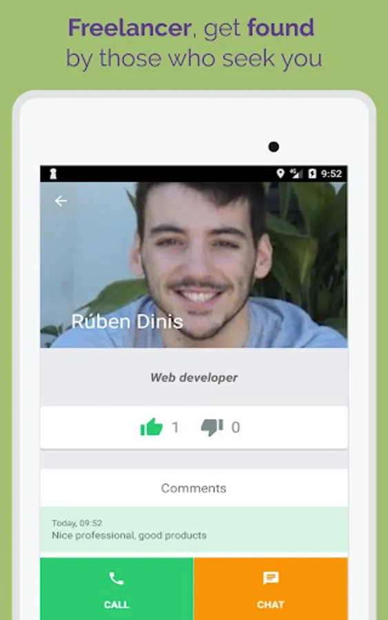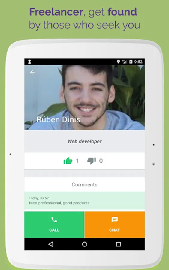 As a customer, you can find professional freelancers nearby, on the real-time maps, so you can chat with them or directly call them, and finally hopefully hire them. Placing a call in the app is free, but the call itself is subject to your regular phone company fees.