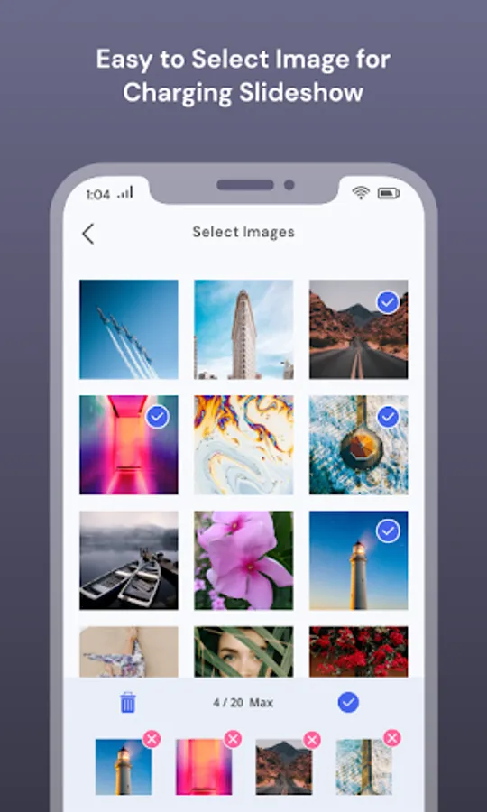 * Select multiple images from phone gallery for battery charging photo slideshow.