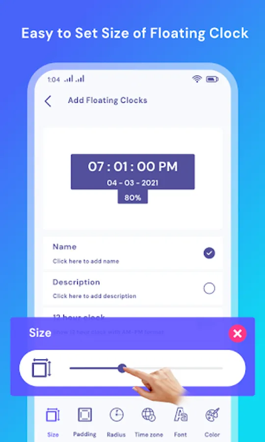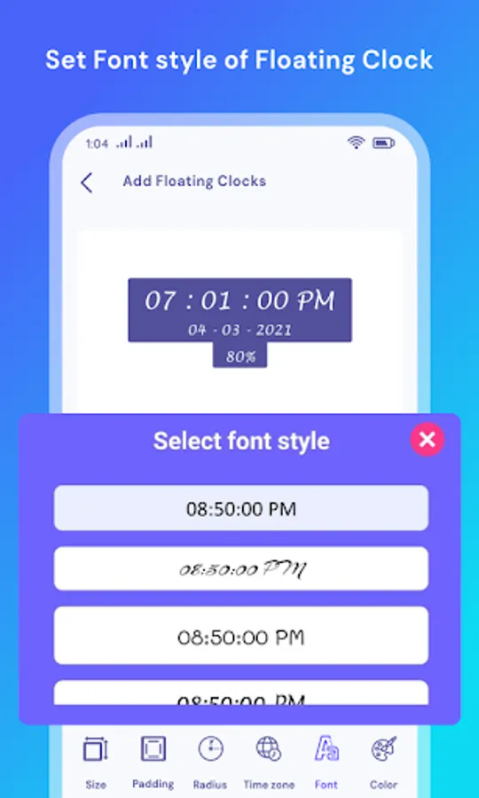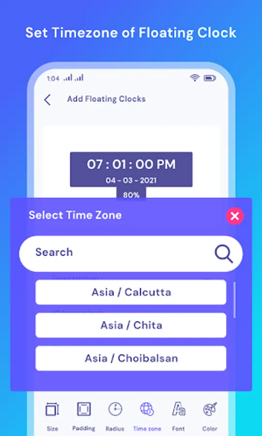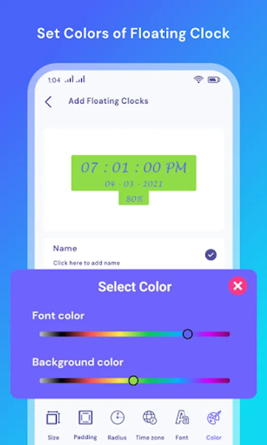 - Choose clock background with adjustable size, padding, radius and color.