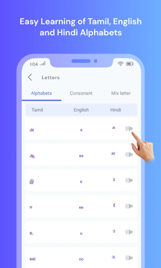 - Alphabet level : Consists of vowels, consonants and Mix Letters which is the most basic step to learn Hindi provided in all learning options.