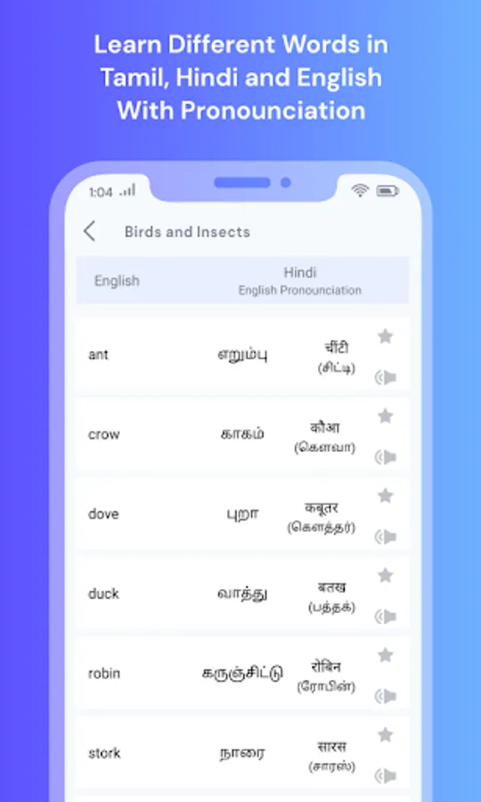 - App has a basic collection of words and sentences that are translated in Tamil, English and Hindi languages.