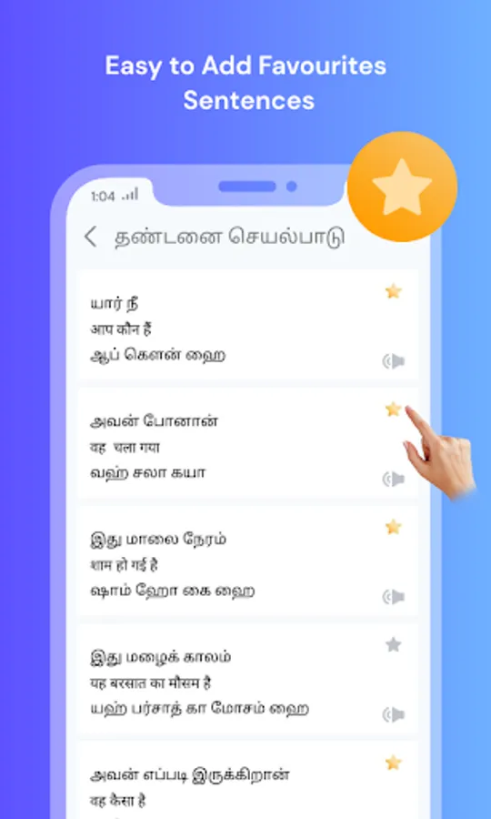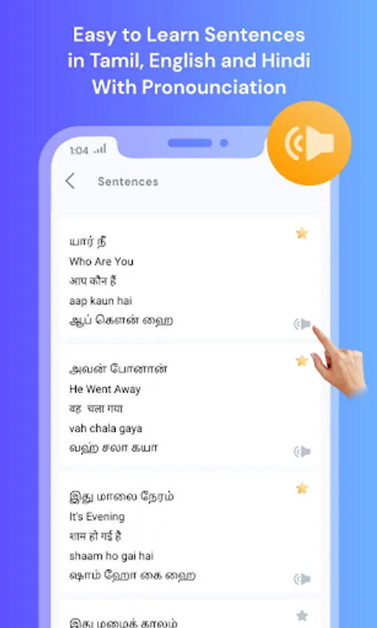 - The third level : Sentence consists of 500+ sentences in each learning option with equivalent English/Tamil to Hindi Translation.