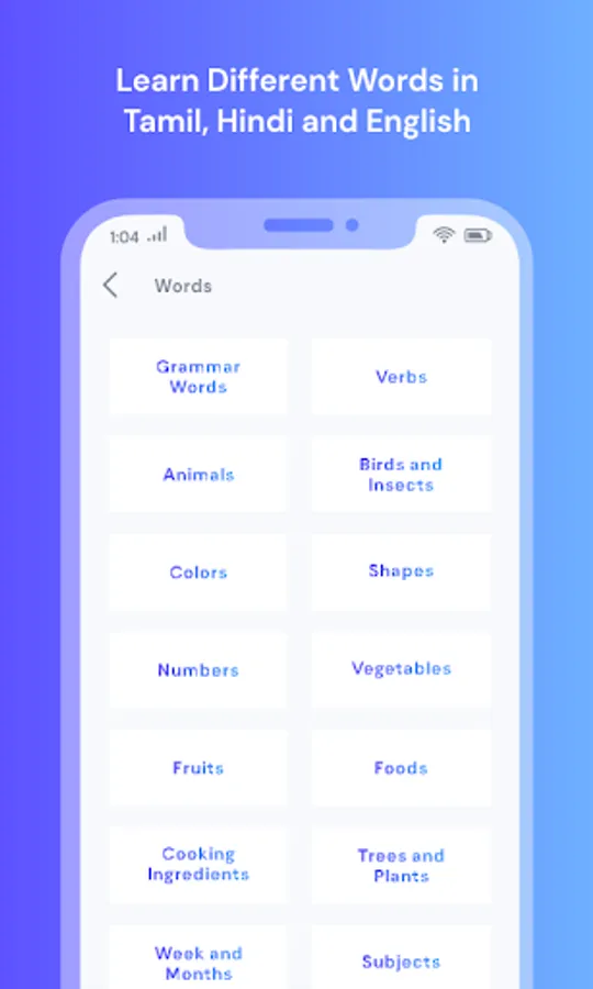 - English to Hindi or Tamil or Hindi Trainer app, each option provides you all the basic necessary things needed to learn Hindi from basic level such as Alphabets, Category wise Words and Sentences.