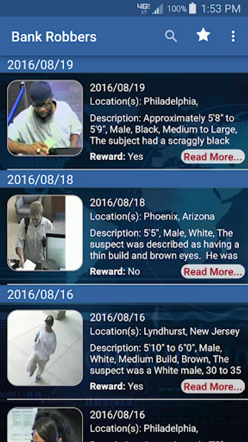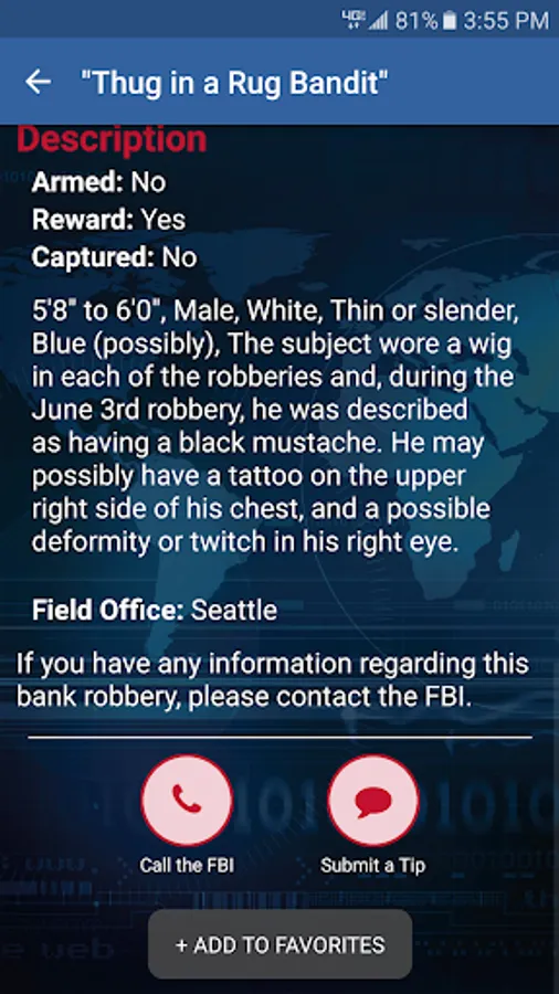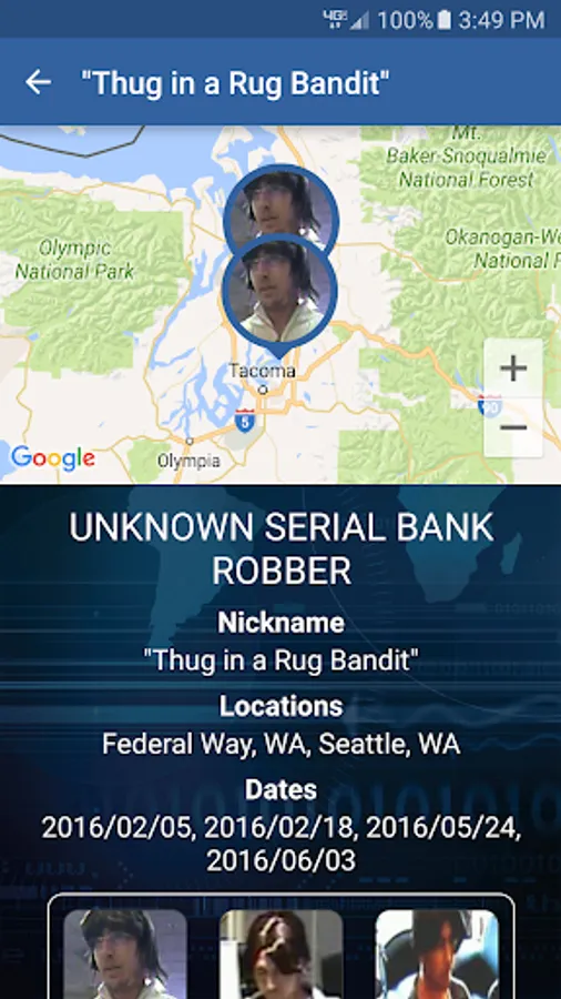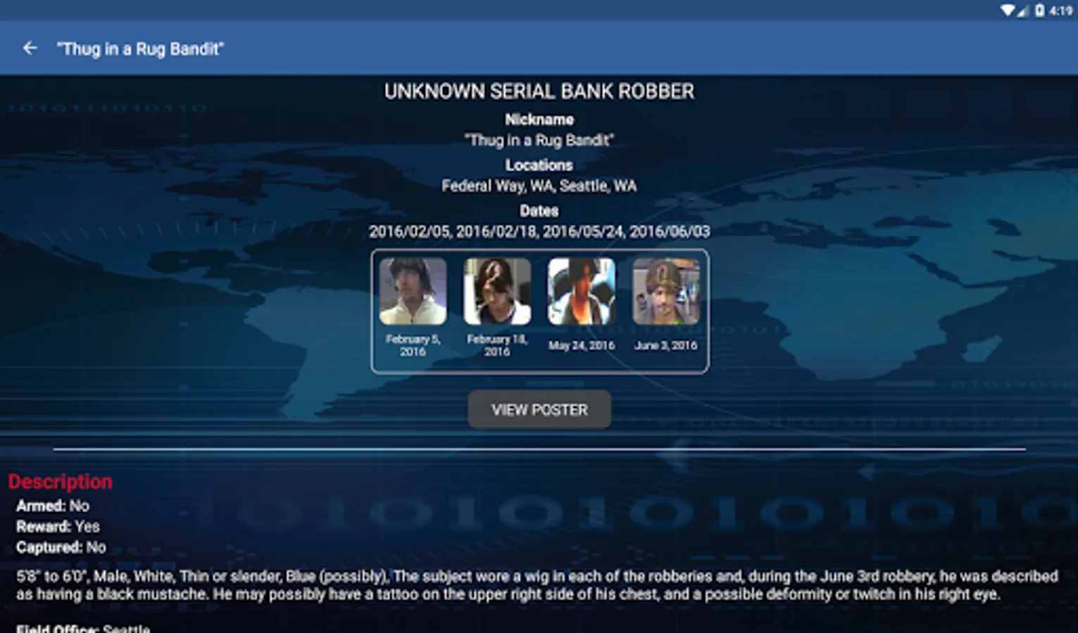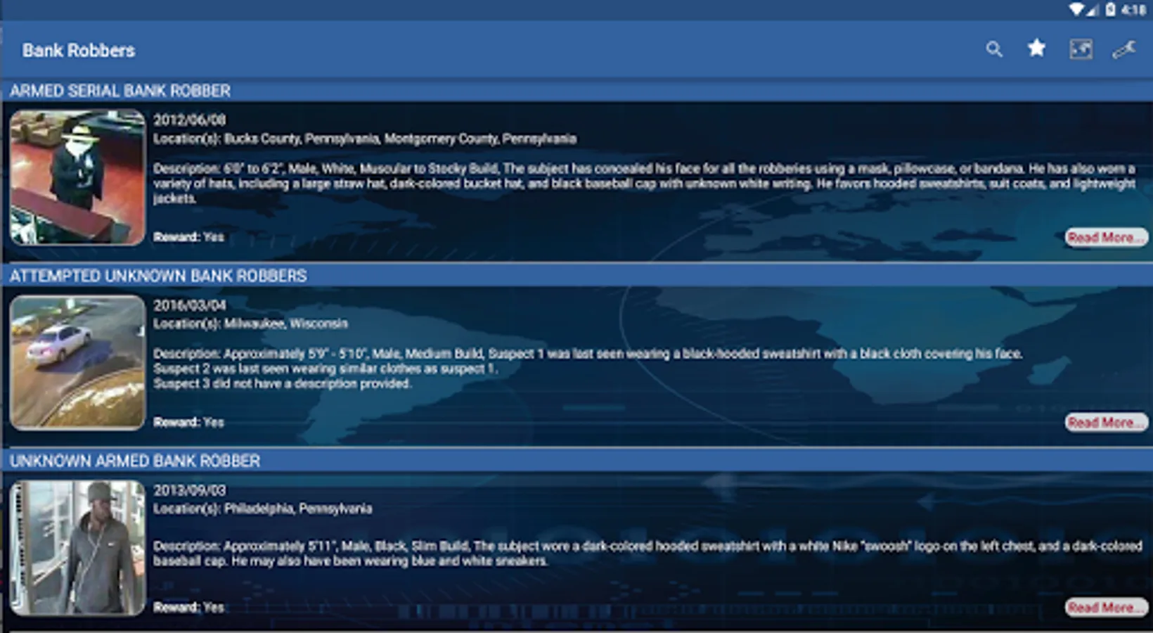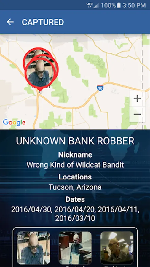This app allows users to view information about unknown bank robbers sought by the FBI. Only bank robbers who have been uploaded to bankrobbers.fbi.gov will be displayed in this app. Not every bank robbery that occurs nationwide will be shown in this app. Users can enable alerts through the app that will inform them when a bank robbery has occurred near their location. Users can also submit tips using the app.