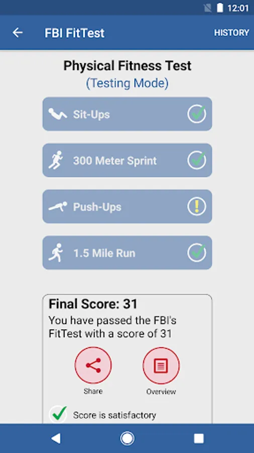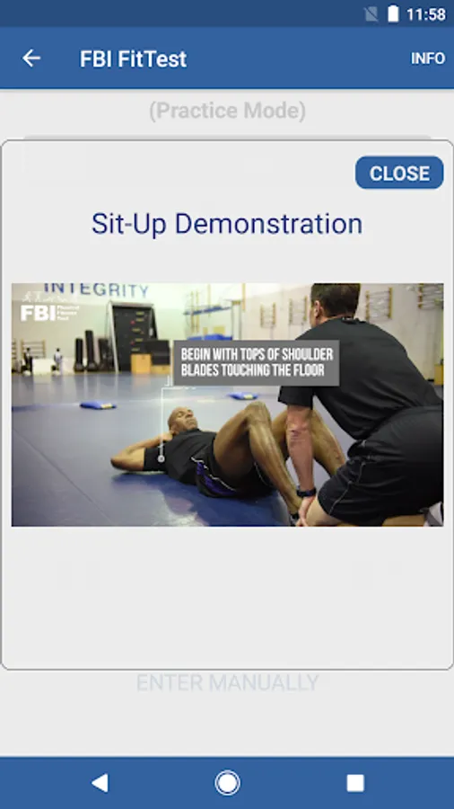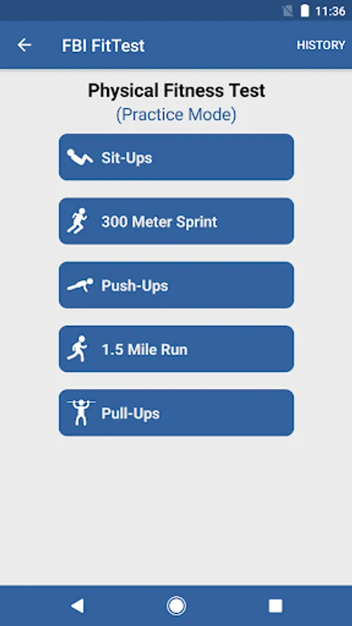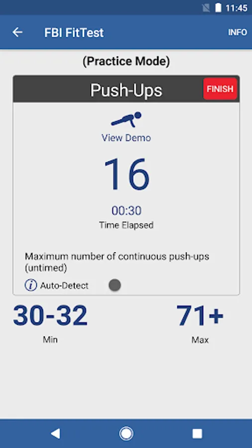 · Two modes – Practice Mode (trying each exercise at your own pace, as many times as you like) or Testing Mode (go through the exercises in the actual Physical Fitness Test order, with prescribed rest breaks).