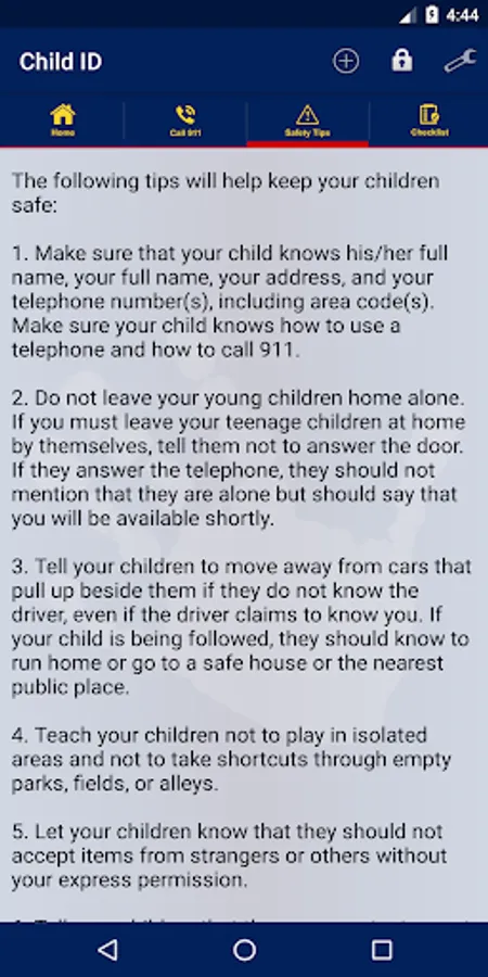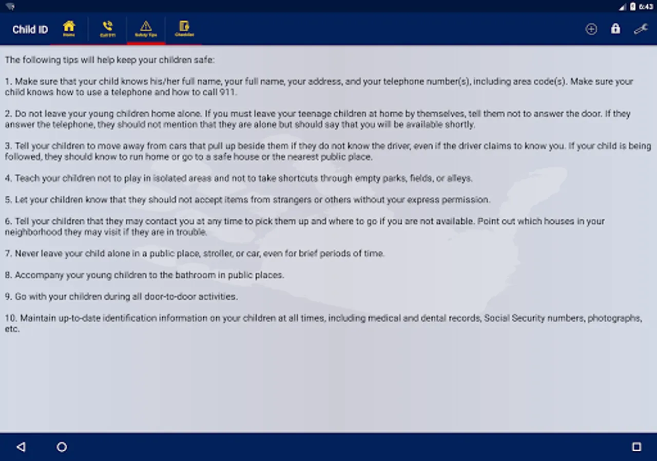 The app includes tips on keeping children safe, as well as specific guidance on what to do in the first 48 crucial hours after a child goes missing. Links to additional resources for families and victims are also provided.