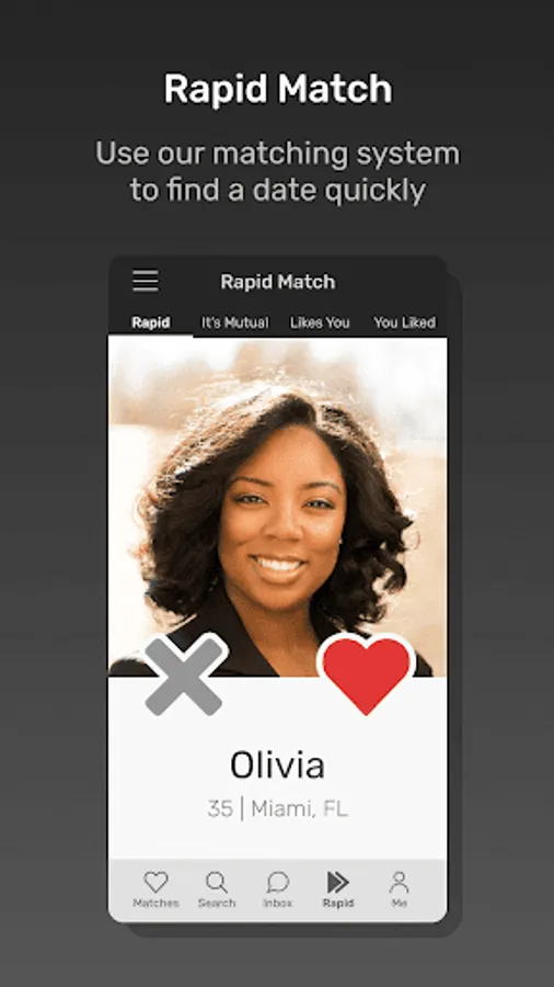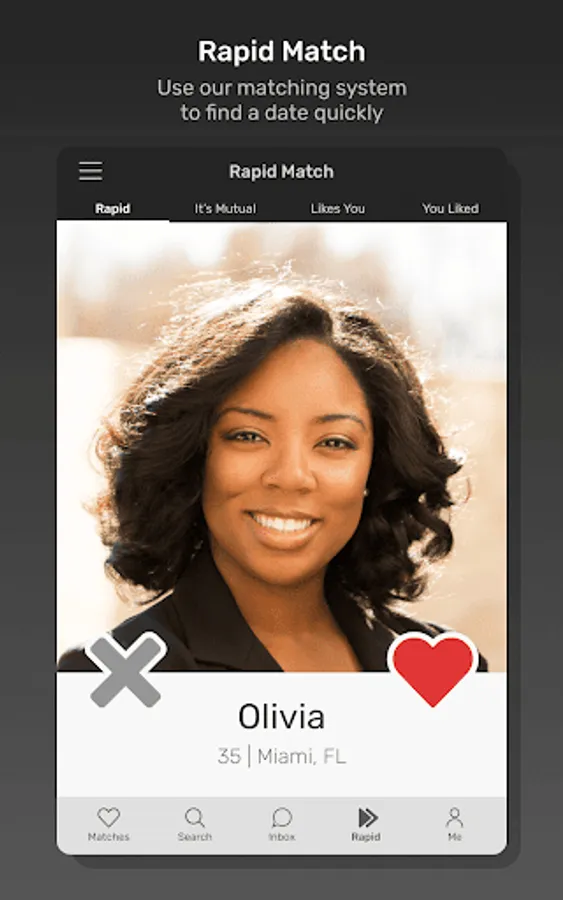 - Rapid Match: Are you in a rush and only want to look at photos? Decide which singles you like here instantly by swiping right or left