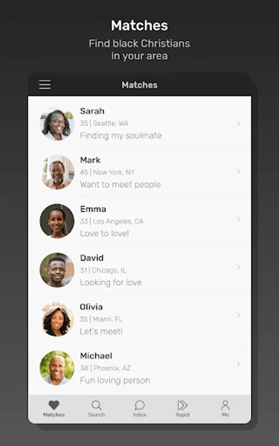 The Black Christian Soulmates dating app is for people of faith who love church. Whether your a senior black Christian looking for love or someone new to the religion, we have thousands of single black Christians you can find.
