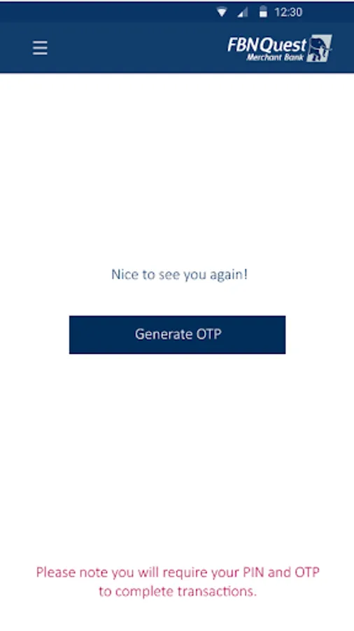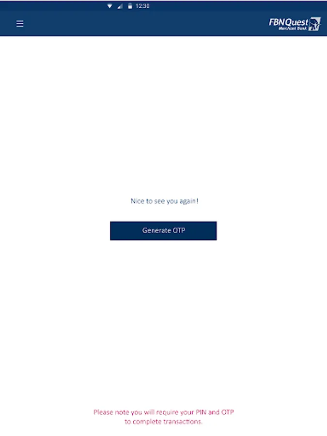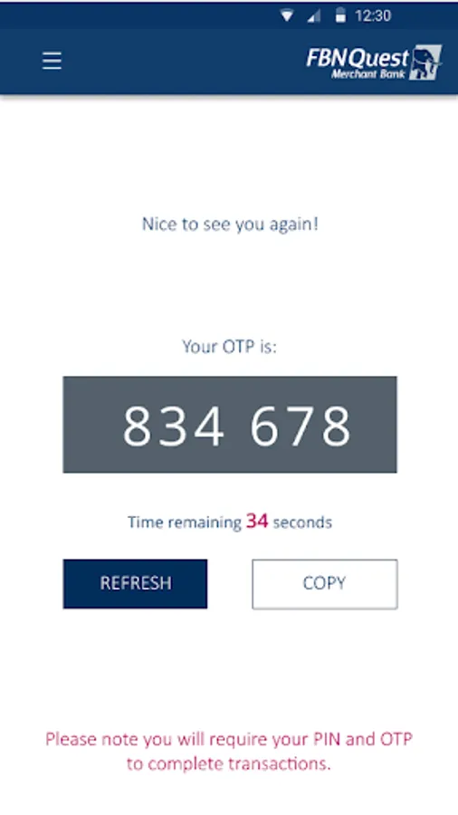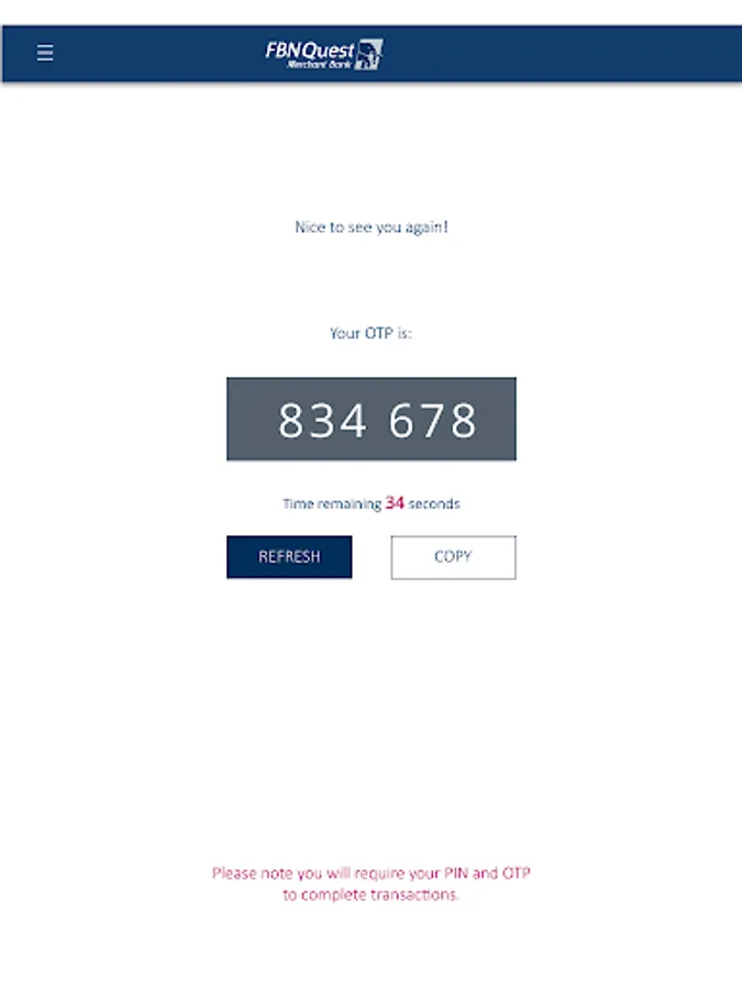 FBNeSecure generates 6-digit One Time Password that can be used to consummate transactional operations securely.