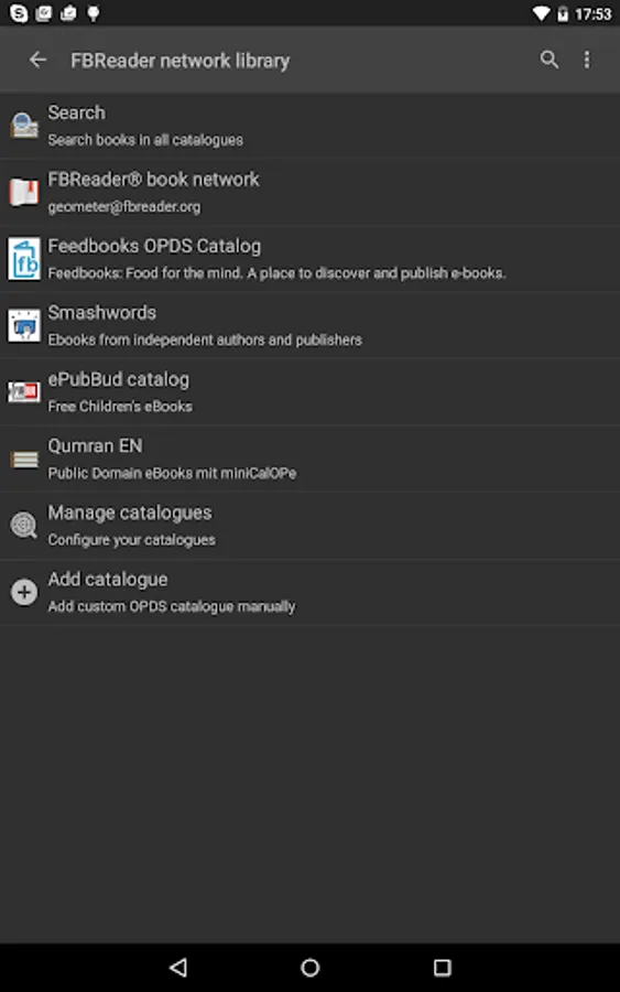 This reader also includes a browser/downloader to access different network ebook catalogs and stores. Several popular English, French, Russian, Chinese, and Polish libraries are included. Custom OPDS catalogs are supported too.