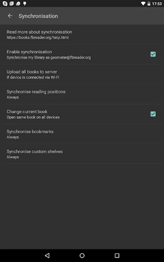 FBReader supports synchronization of your library and/or reading positions with the FBReader book network (https://books.fbreader.org/), a Google Drive™ based cloud service. The synchronization is disabled by default; to enable and configure it, use the preferences dialog.