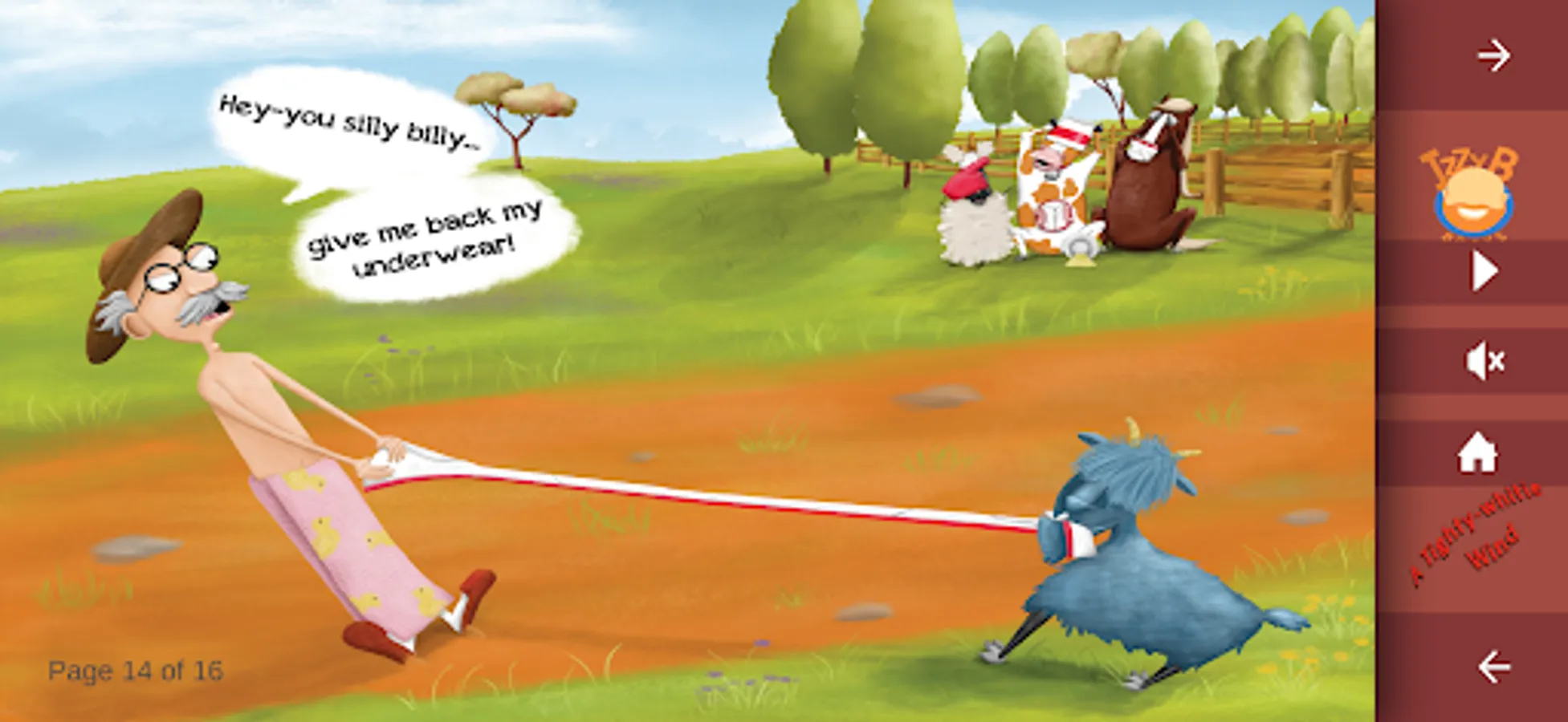 Hold on to your undies! There's a storm a-brewin'. It's a dreaded tighty-whitie wind and no undies are safe. When this terror of tighty-whities tears through the farm it spreads underwear about and each animal gets their own pair. To the horse, they'll make a nice feed bag. To the cow, they'll make a wonderful udder warmer. But don't let the goat get a pair. He'll just eat 'em up!