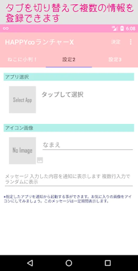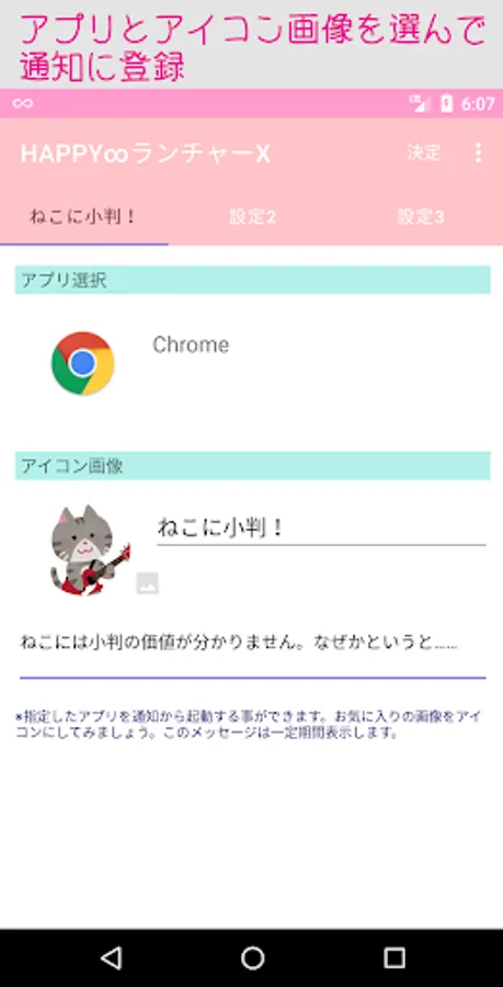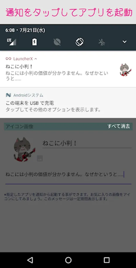 This is a tool to launch the specified application from notifications. You can specify any icon to be displayed in the notification from photos or illustrations.