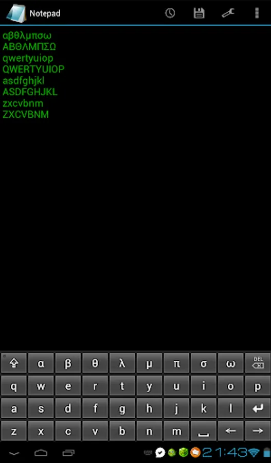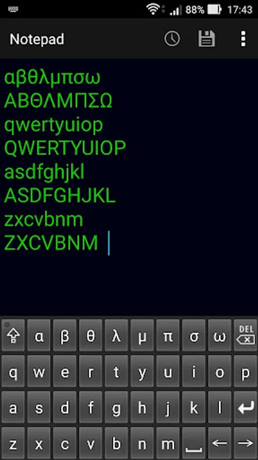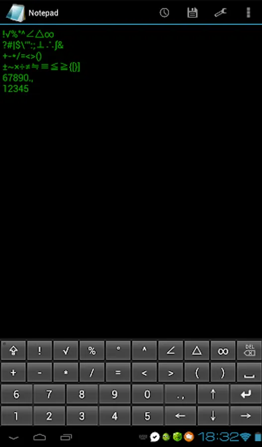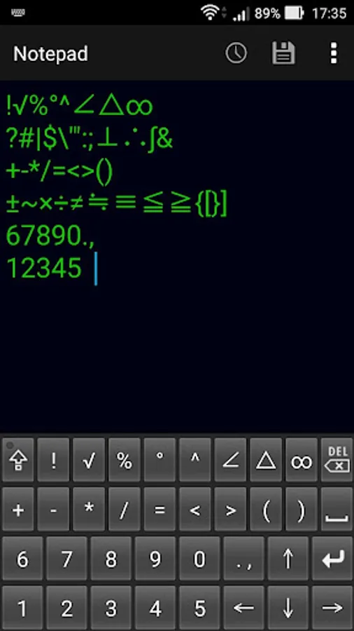You can enter digits from 0 to 9 and all alphabets, Greek letters "α, β, θ, λ, μ, π, σ, ω" and mathematical symbols "!?√#|%$°'"^:;∠⊥△∴∞∫&+±-~*×/÷=≠≒≡<≦>≧({[)}].,".