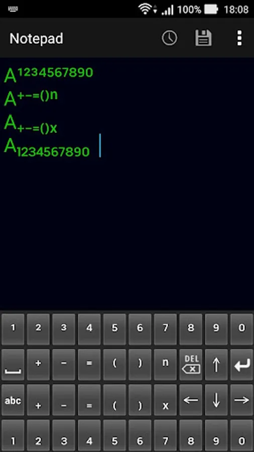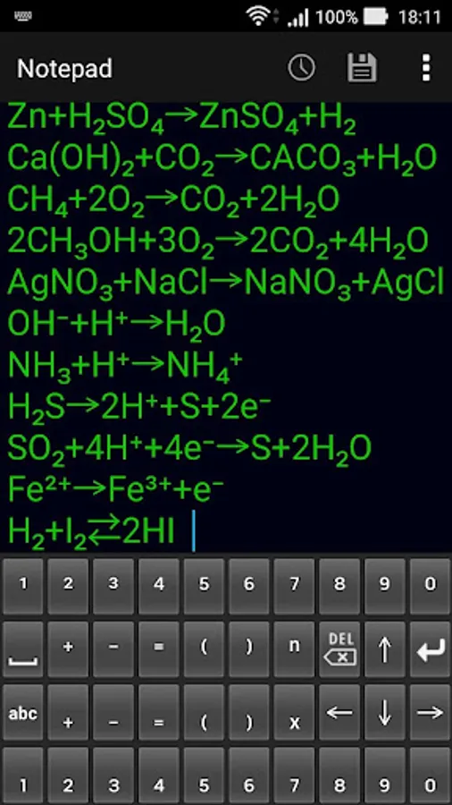 You can enter all alphabets for element symbols, numbers from 0 to 9, superscript "⁰,¹,²,³,⁴,⁵,⁶,⁷,⁸,⁹,⁺,⁻,⁼,⁽,⁾,ⁿ", subscript "₀,₁,₂,₃,₄,₅,₆,₇,₈,₉,₊,₋,₌,₍,₎,ₓ", and "+,→,⇄,↑,↓,(,),[,]" for chemical equation symbols.