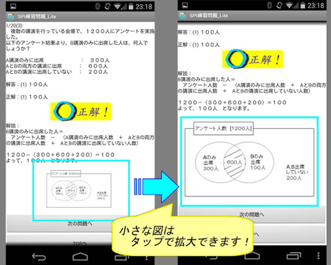 また、問題,解説を見やすくする工夫として、図に触れて(タップ)頂くと拡大する機能を搭載しております。日頃の勉強成果確認の一つとして、通勤・通学時などでご使用頂ければと思います。