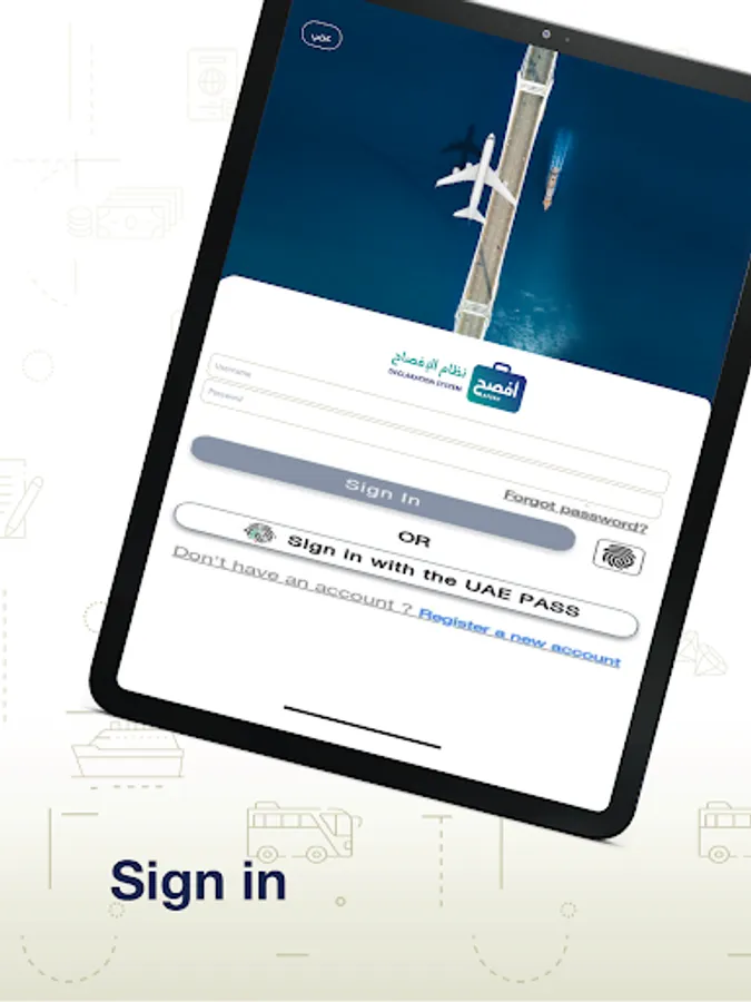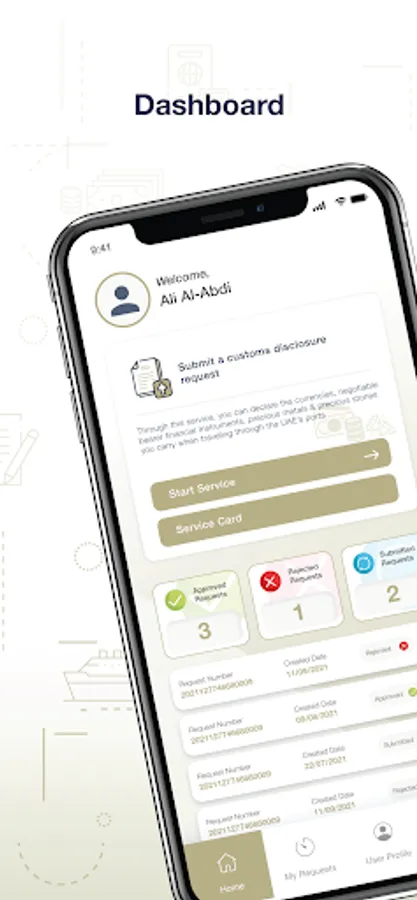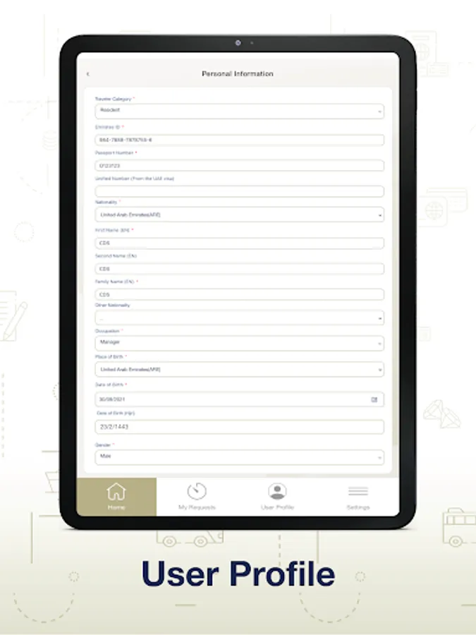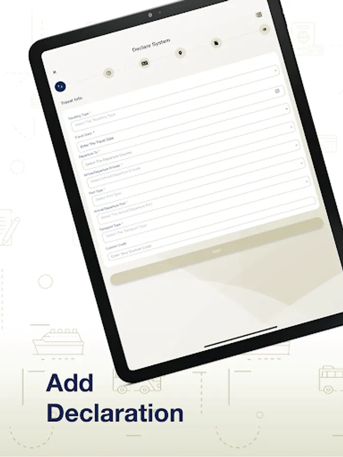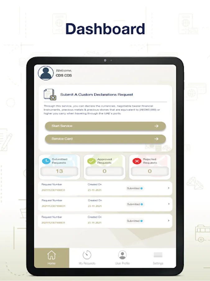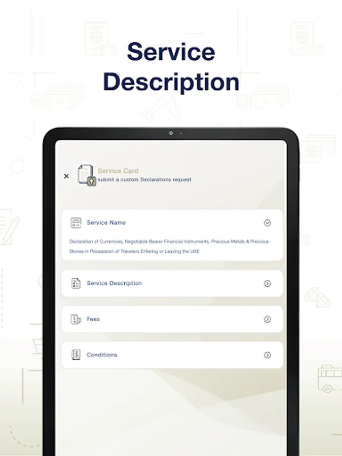 Traveler’s declaration app of currencies (e.g. Emirates Dirham, US Dollar, Indian Rubee, … etc.), negotiable financial instruments (e.g. Visa credit cards, cheques … etc.) and precious metals & stones (e.g. Gold, Silver, Platinum, … etc.) in their possession. Which in total is greater than or equal to (AED60,000) or any other equivalent currency.