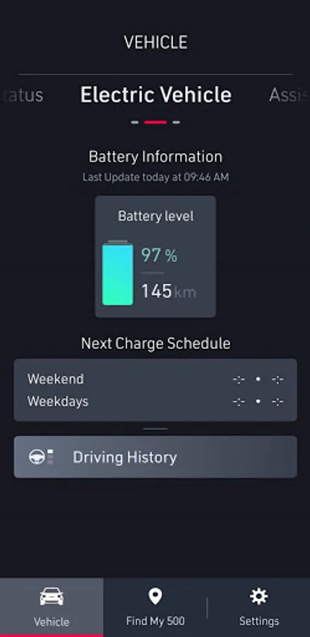 Vehicle: access to the main vehicle usage data, assistance network, description of main warning lights, battery usage, contact numbers for assistance