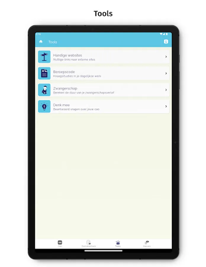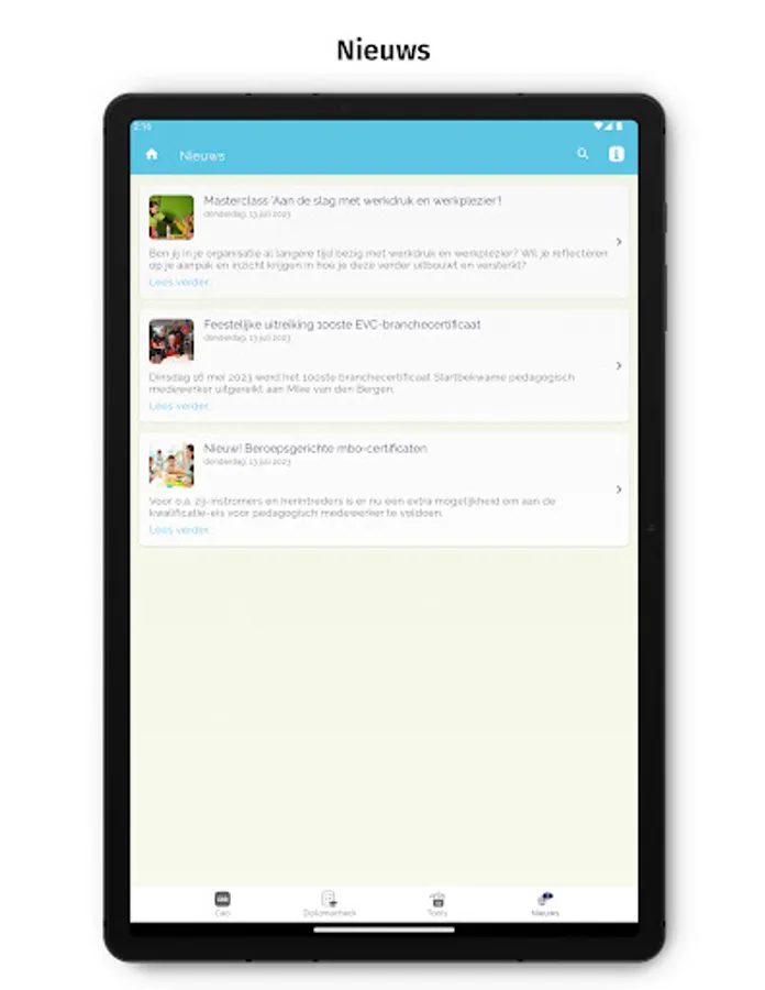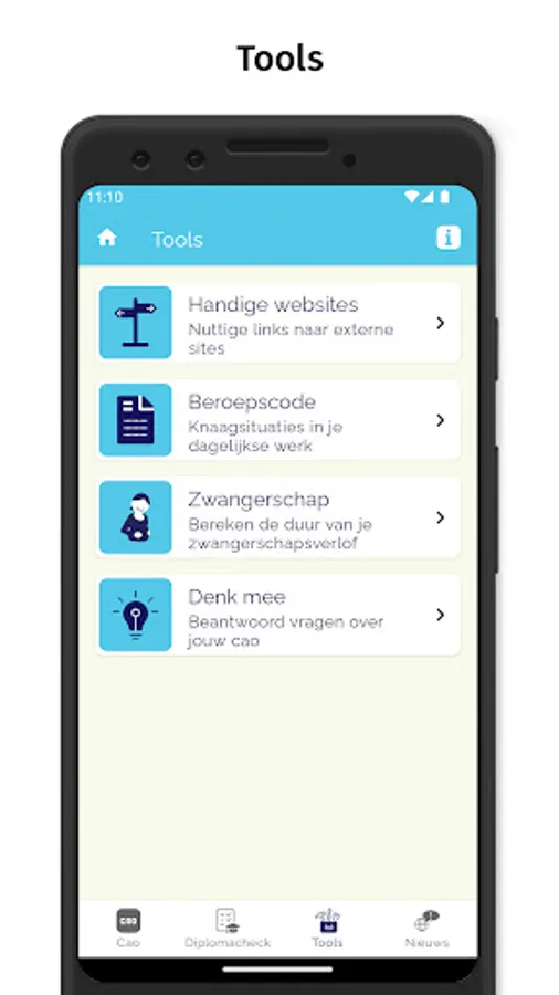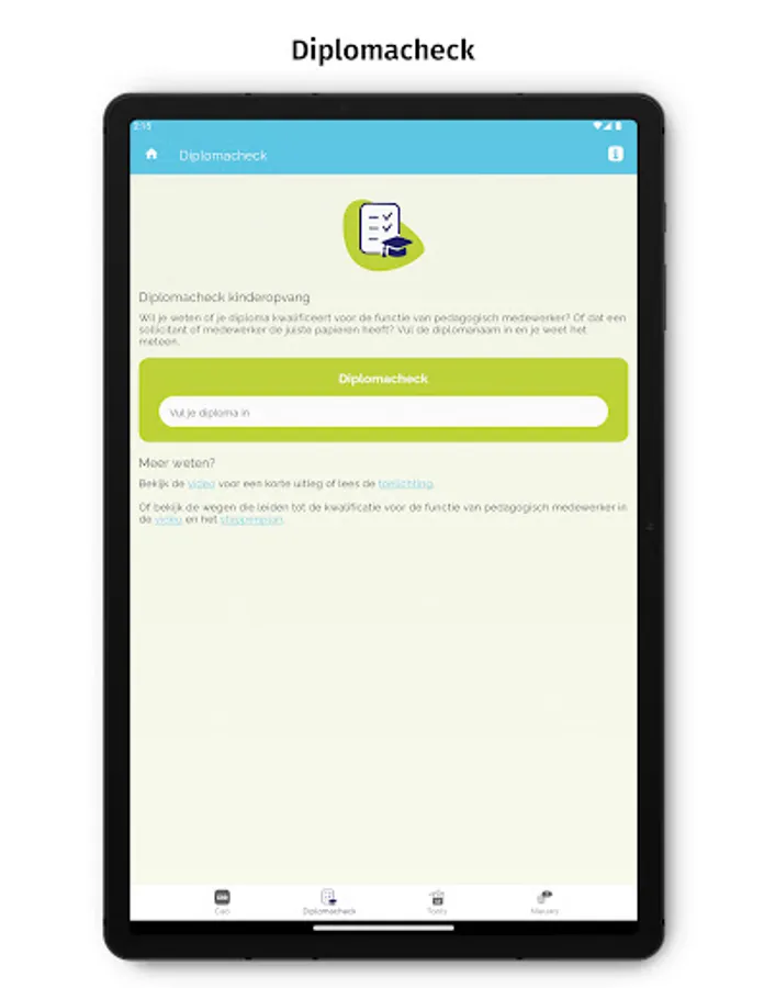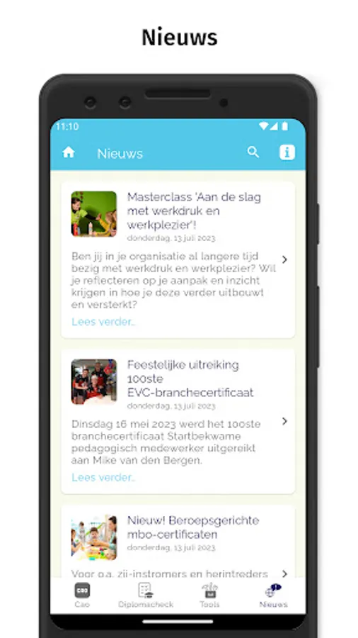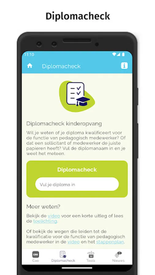 The full collective labor agreement text and frequently asked questions can be found in the app under the heading 'CAO'. With the diploma check you can immediately see whether you can work in childcare with your diploma. Under 'Tools' you can calculate the duration of maternity leave and find help and information about the professional code. You will also find links to useful sites. Under 'Think with us' you will be asked to answer a short topical question (a 'poll'). You can immediately see how other users have answered the question up to that point. A new question will be available on a regular basis. If you allow push notifications, you will automatically be notified when there is a new question. We also keep you informed of collective labor agreement topics via the News section in the app.