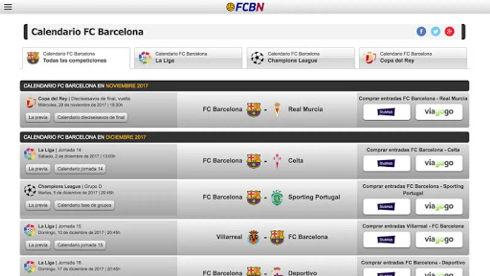 Calendar with all parties and competitions. International guide schedules and TV channels broadcast live and online, the FC Barcelona team meetings.