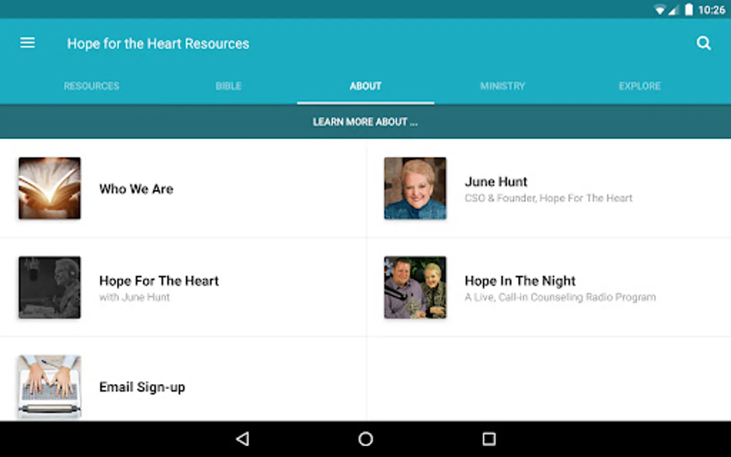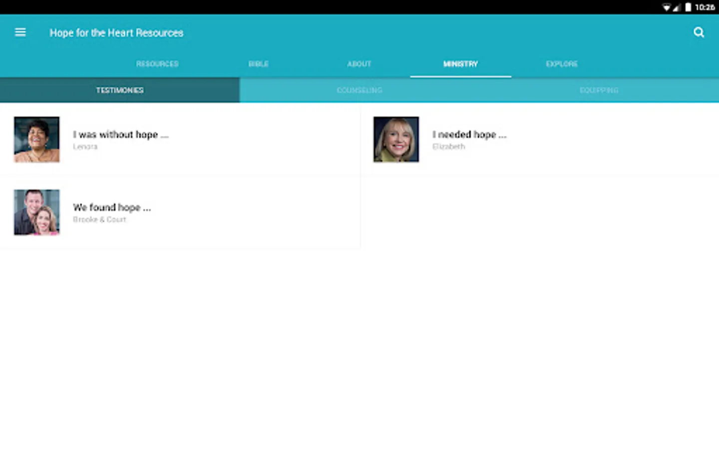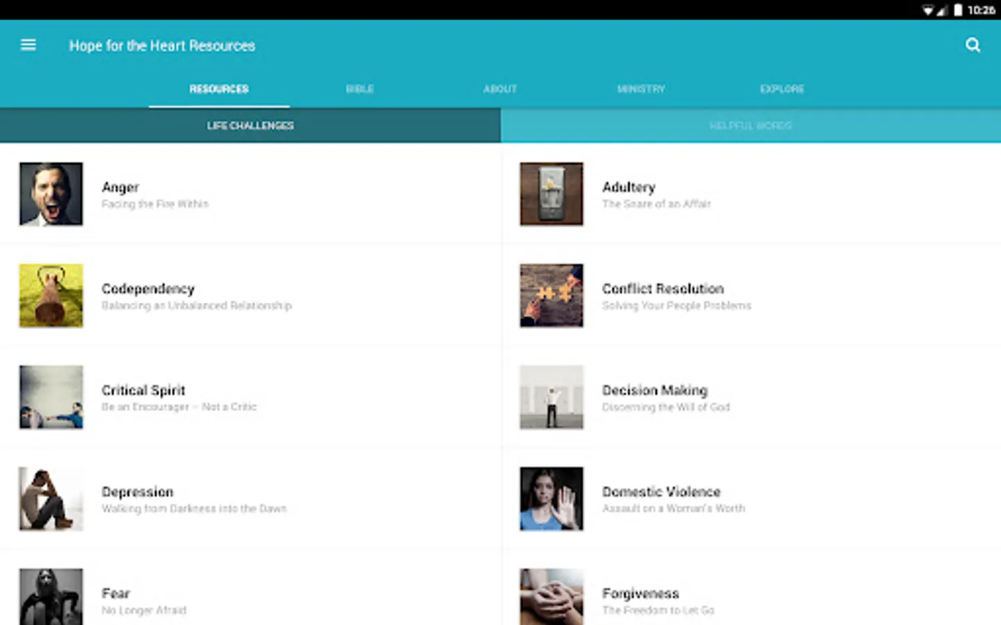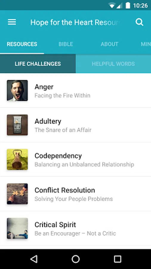 The Hope for the Heart Resources App was created with the Subsplash App Platform.