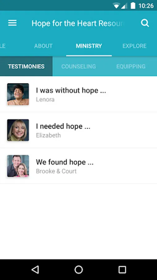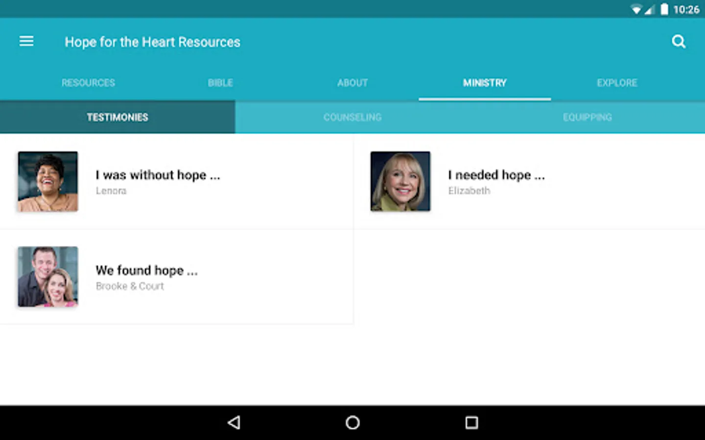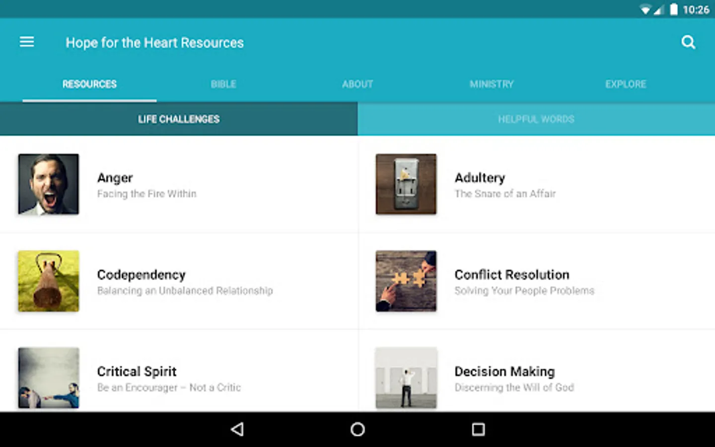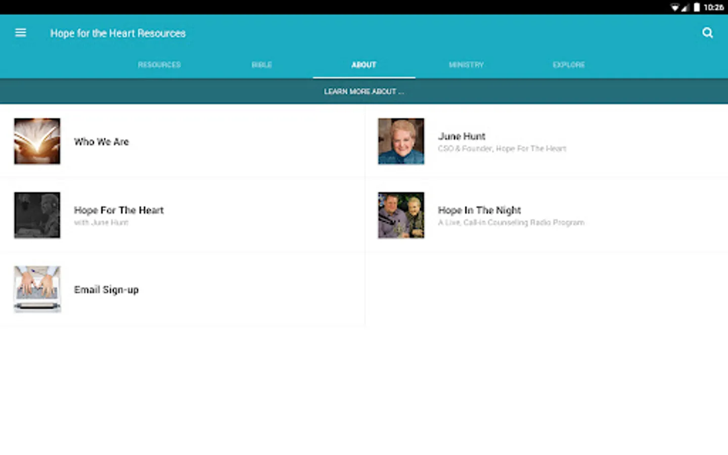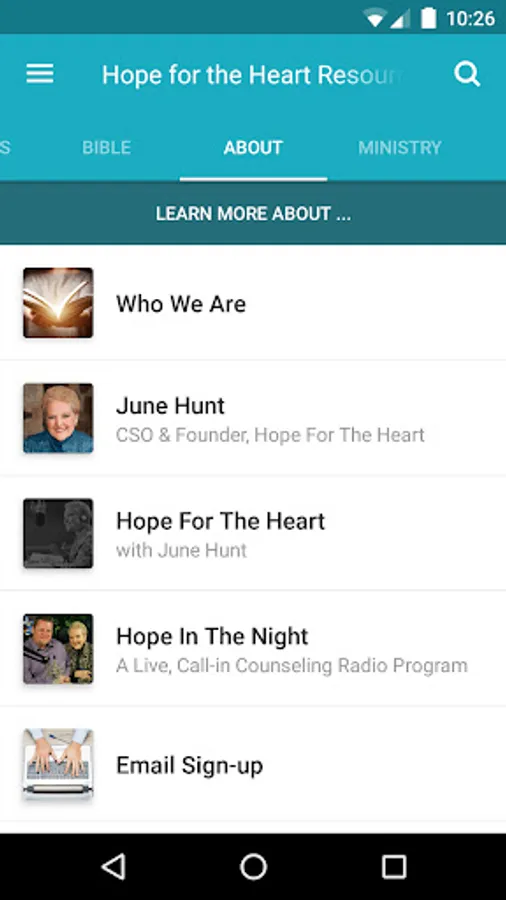 The Hope for the Heart Resources App was created with the Subsplash App Platform.