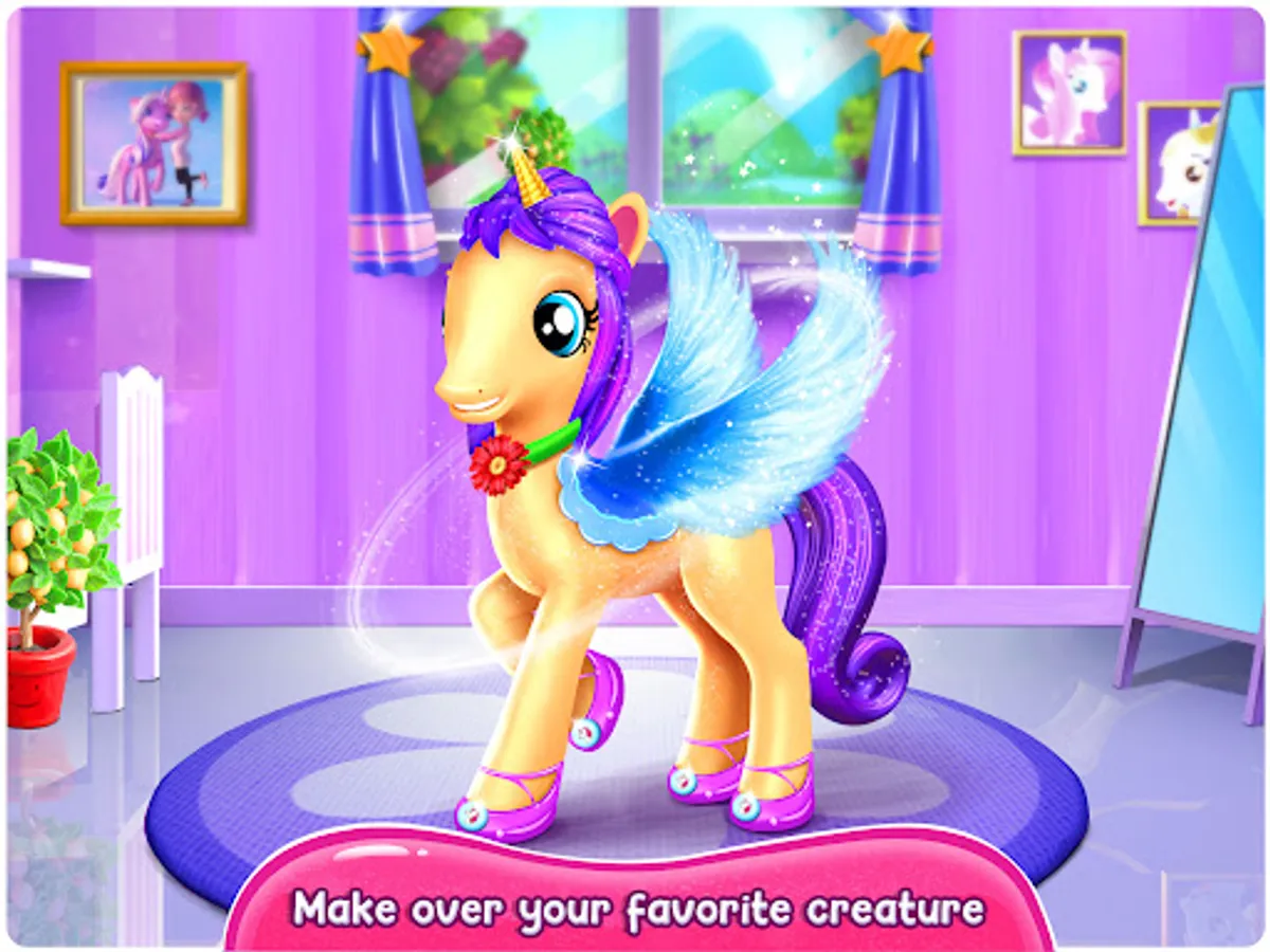 Little Unicorn Pony will be an ideal pet for you to take care of as you raise your own ponies and horses in this unicorn pony game. Enjoy many different activities with your pony friends and horse pets as you raise tooth fairy with them and take care of the princess magical world pony in the stable or farm little pony Fashion dress up games. Braiding the hair of the horse’s mane to get the prettiest horse hairstyle and taking care of little ones from the pony family in pony games for girls.Come first in the pony race of magic princess world pony runner games.Pony and horses await in the magical pony land where you can live with and carry out many fun activities with your tailed animal companions of unicorn babies. Race, rest, eat, dressup and more with our horse friends for little unicorn pony makeover. Explore the special island designed to accommodate ponies and their friends in unicorn games. Go racing and gallop across obstacles of pony town. Examine ponies for injuries after a tough race of unicorn pony runner. Feed the ponies from market made special food for unicorn pony games.